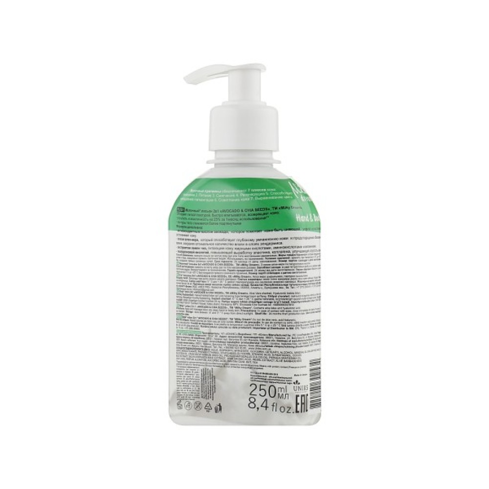 «Авокадо і насіння чіа» бренда Milky Dream — ніжний та ароматний лосьйон, який подбає про красу шкіри, а також допоможе зробити контури тіла більш підтягнутими. Унікальна формула з гіалуроновою кислотою, олією авокадо, екстрактом насіння чіа і соком алое вера — потужний енергетичний коктейль краси та молодості. Засіб насичує шкіру великою кількістю вітамінів і антиоксидантів, цінними жирними і амінокислотами, мікроелементами і дорогоцінною вологою. Результат — бездоганна гладкість, пружність та сяйво!