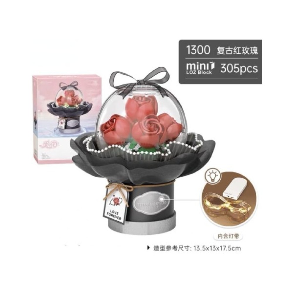 Особливість цього конструктора — це його тематика, яка переносить в чарівний світ квітів. У наборі 305 деталей, які дозволяють створити букет із червоних троянд. Вічні квіти — троянди, що символізують любов і пристрасть, стануть оригінальною прикрасою для дому або офісу. Вони мають розмір 13,5x13x17,5 см, що ідеально підходить для розміщення на столі або полиці.