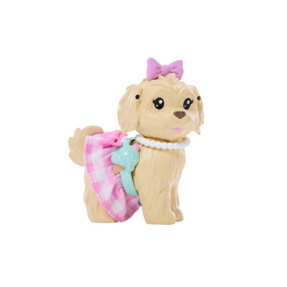 Barbie та її пухнастий друг вдягнені у рожеві картаті комплекти. Лялька має рожеві туфлі на підборах та модний костюм із топом з об’ємними рукавами і спідницею з бантиками, а песик – спідничку з рюшами й бантом.