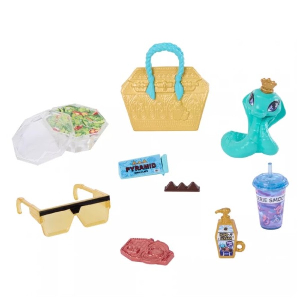 • Лялька Клео Де Найл неймовірно велична! З її коброю Гіссетт та 7 аксесуарами вона готова стильно керувати учнівським колективом Monster High.