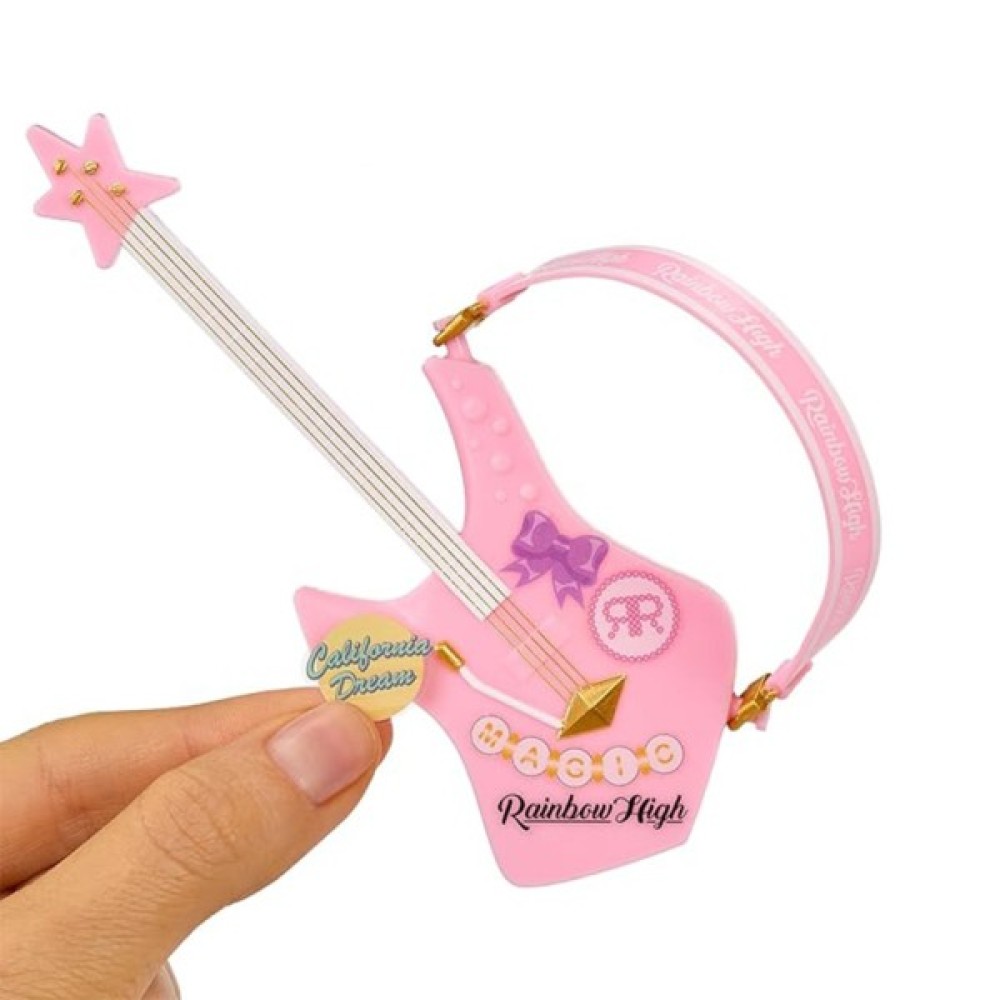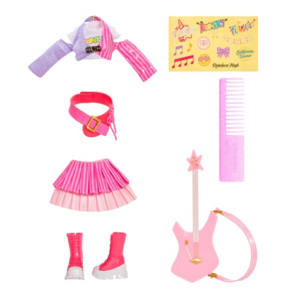 1 лялька,1 худі, 1 пара шортів, 1 пара взуття, 1 ремінь, 1 іграшкова бас-гітара з ремінцем, 1 аркуш