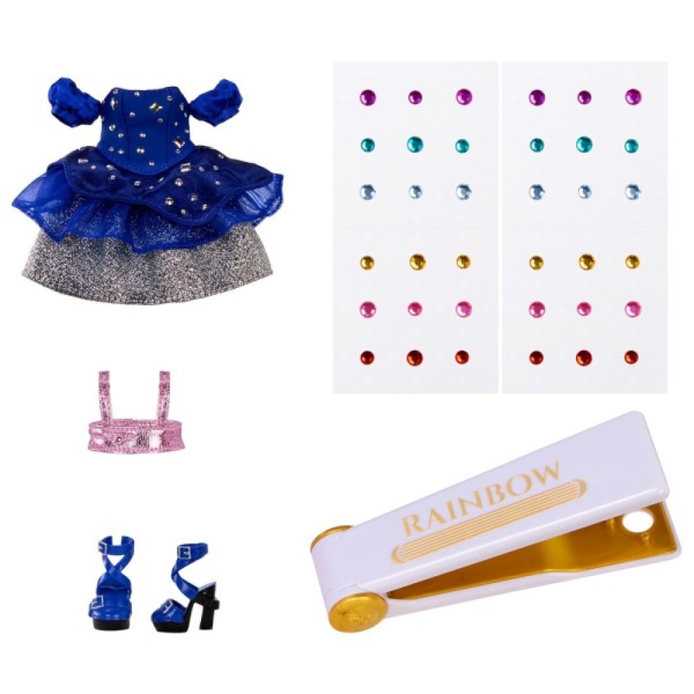 Лялька RAINBOW HIGH серії "Be Dazzling" – ЖЕНЕВ'ЄВА – чарівна красуня з насичено-синім волоссям, прикрашеним ніжними рожевими й лавандовими пасмами, та великими мерехтливими фіалковими очима. Її стильне вбрання у відтінках індиго й срібла випромінює чарівність нічного неба, поєднуючи елегантність, загадковість і сяючий шарм!