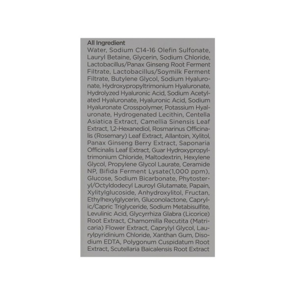 Склад water, sodium c14-16 olefin sulfonate, lauryl betaine, glycerin, sodium chloride, lactobacillus/panax ginseng root ferment filtrate, lactobacillus/soymilk ferment filtrate, butylene glycol, sodium hyaluronate, hydroxypropyltrimonium hyaluronate, hydrolyzed hyaluronic acid, sodium acetylated hyaluronate, hyaluronic acid, sodium hyaluronate crosspolymer, potassium hyaluronate, hydrogenated lecithin, centella asiatica extract, camellia sinensis leaf extract, 1,2-hexanediol, rosmarinus officinalis (
