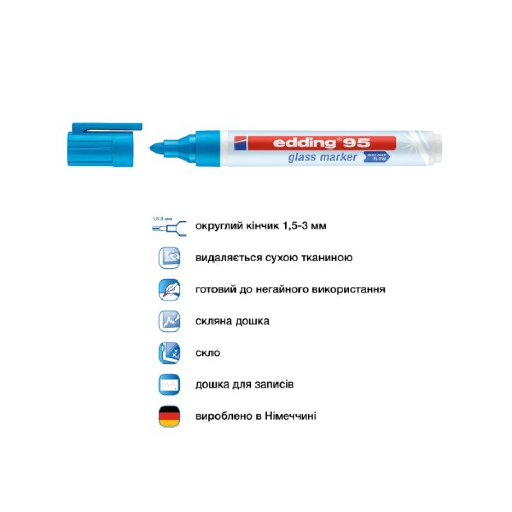 Маркер edding Glass e-95/06 підходить для нанесення написів і маркування на скляні поверхні, а також скляні та білі дошки. Стане чудовим інструментом для створення блискучих написів, малюнків і діаграм. Флуоресцентне чорнило практично без запаху, світлостійке та має непрозорий колір. Напис легко витирається сухою тканиною, не залишаючи слідів на поверхні. Округлий пишучий вузол. Ширина лінії: 1,5-3 мм.