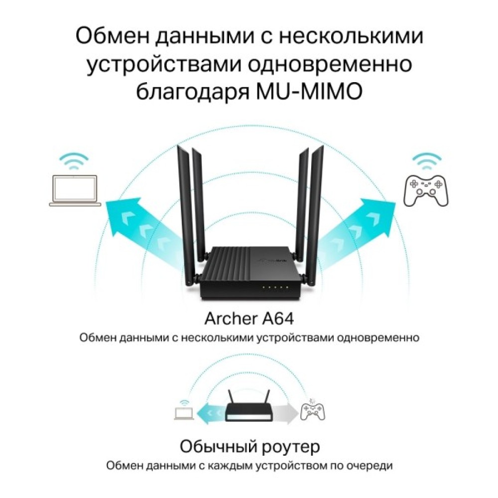 Технологія MU-MIMO забезпечує одночасне підключення декількох пристроїв без втрати якості з'єднання, що робить ARCHER A64 ідеальним для великих родин або офісів з численними гаджетами. Завдяки чотирьом незнімним антенам, ви отримаєте покриття на великій площі, а технологія Beamforming покращить якість сигналу для пристроїв, які знаходяться далі від маршрутизатора.