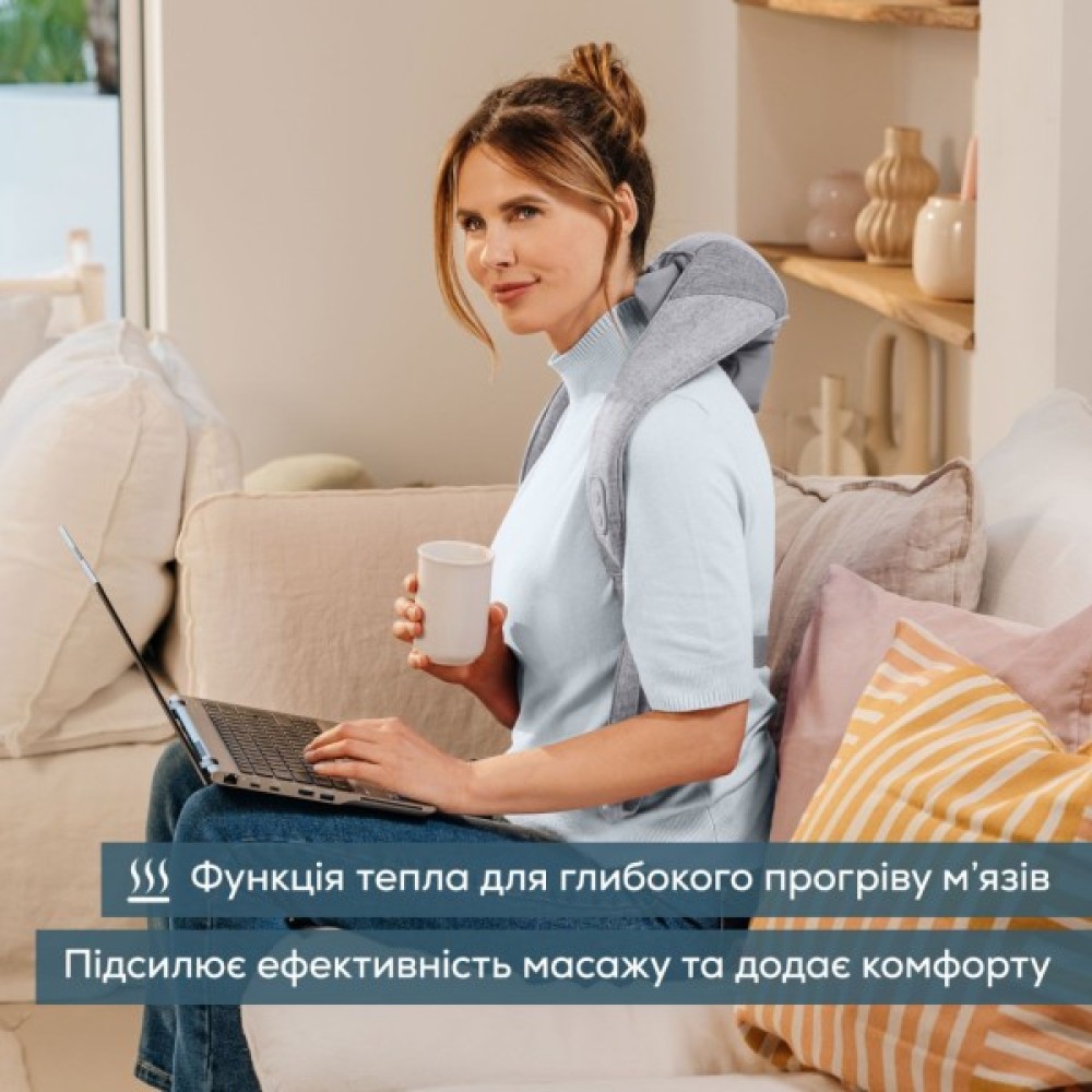 Масажер для шиї забезпечує комфортний та глибокий розминаючий масаж. Чотири масажні головки та два масажні «пальці» імітують рухи рук. Це створює ефект, як при справжньому масажі. Працює від акумулятора до 2 годин без підзарядки. Зручні ремінці для кріплення на плечах дозволяють залишати руки вільними. Ручні петлі дозволяють легко налаштувати інтенсивність масажу. Функція нагріву підсилює ефект та допомагає розслабитися. Прекрасний варіант для подарунку