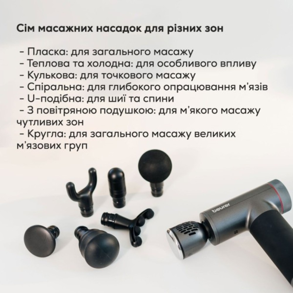 • 7 насадок: пласка, холодна та тепла, кулькова, з повітряною подушкою, кругле кріплення, спіральна, U-подібна