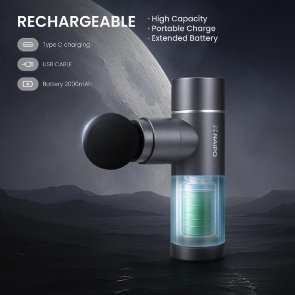 Основою пристрою є безщітковий двигун, що поєднує стабільність, довговічність і знижений рівень шуму. Вбудований акумулятор ємністю 2000 мА·год дозволяє використовувати масажний пістолет автономно, без постійної прив’язки до джерела живлення. Такий формат особливо зручний для відновлення після тренувань, роботи в офісі або подорожей, коли важливі мобільність і незалежність.