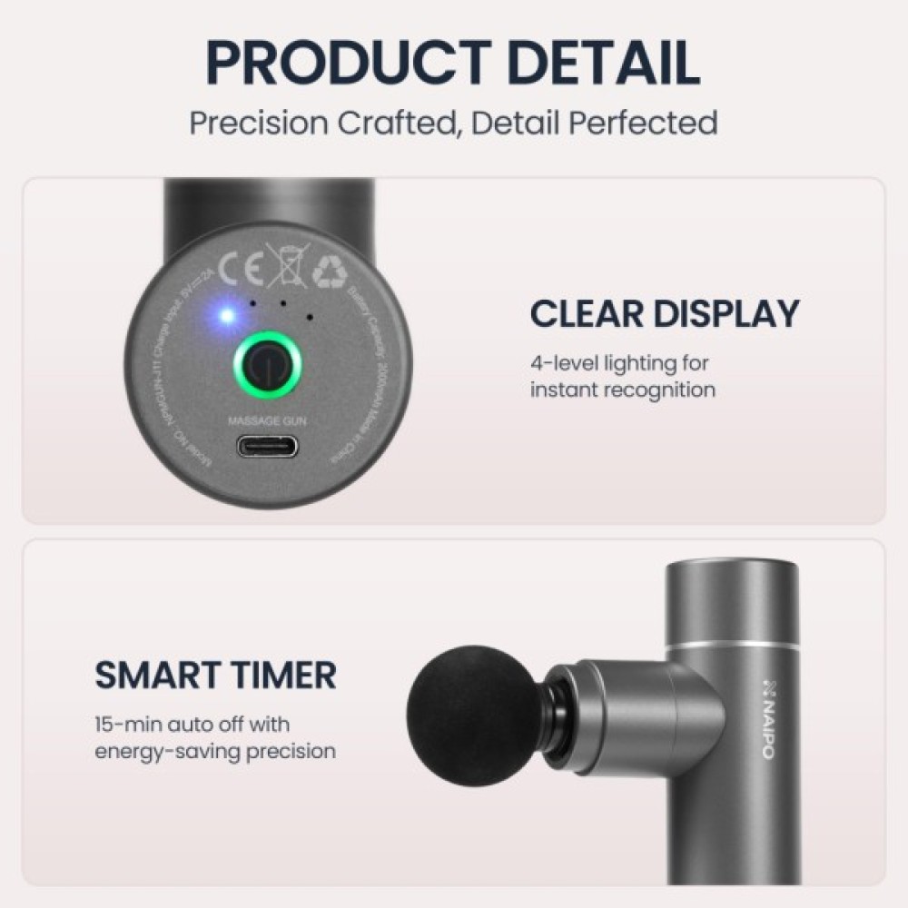 NAIPO NPMGUN-J11 MASSAGE GUN орієнтований на широку аудиторію — від людей, які шукають щоденне м’язове розслаблення після робочого дня, до спортсменів і прихильників активного способу життя. Компактність, збалансована потужність і продумана безпека формують універсальний інструмент для регулярного догляду за тілом без складних налаштувань і зайвих аксесуарів.