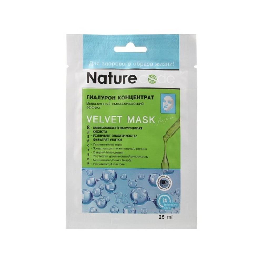 Маска для обличчя «Гіалурон концентрат» бренда Nature Code призначена для підтягнутого виду шкіри. Вона стане прекрасним варіантом для догляду за епідермісом, який втратив тургор. Формула засобу розроблена на основі восьми інтенсивних інгредієнтів, зокрема натуральних екстрактів і олій, муцина равлика, аргініна, алантоїна, амінокислот і гіалуронової кислоти. Продукт розгладжує мікрорельєф, насичує живильною вологою і коригує овал обличчя, роблячи його чіткішим і виразнішим.