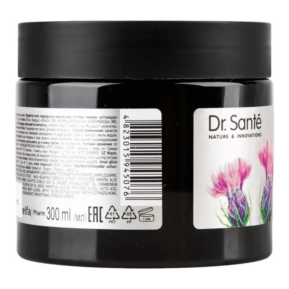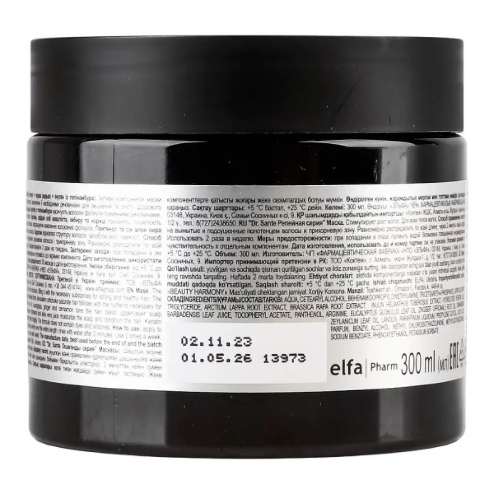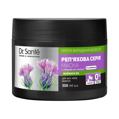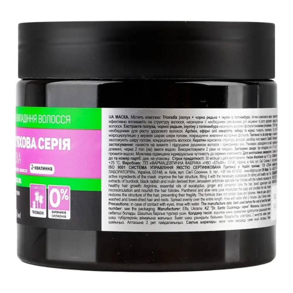 Двохвилинна маска Dr. Sante від випадіння волосся містить активні компоненти, які сприятливо впливають на відновлення і зміцнення структури волосся.