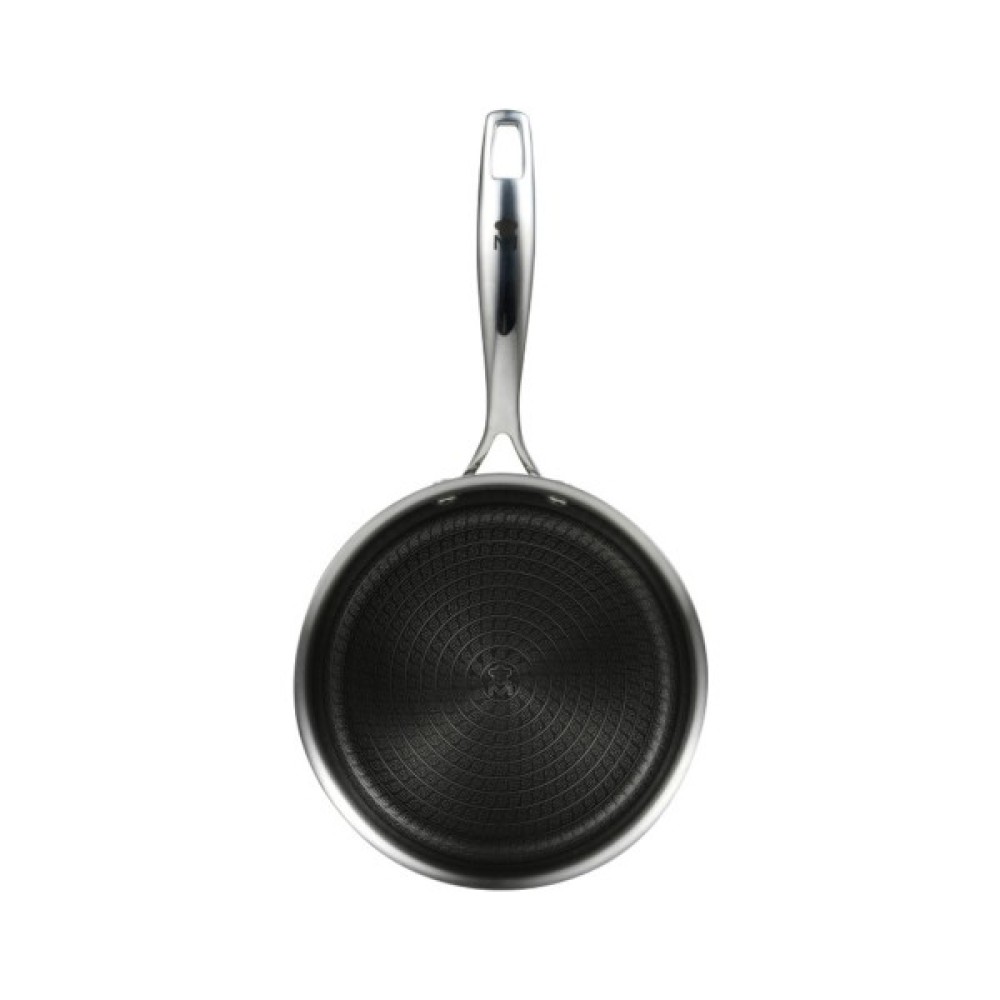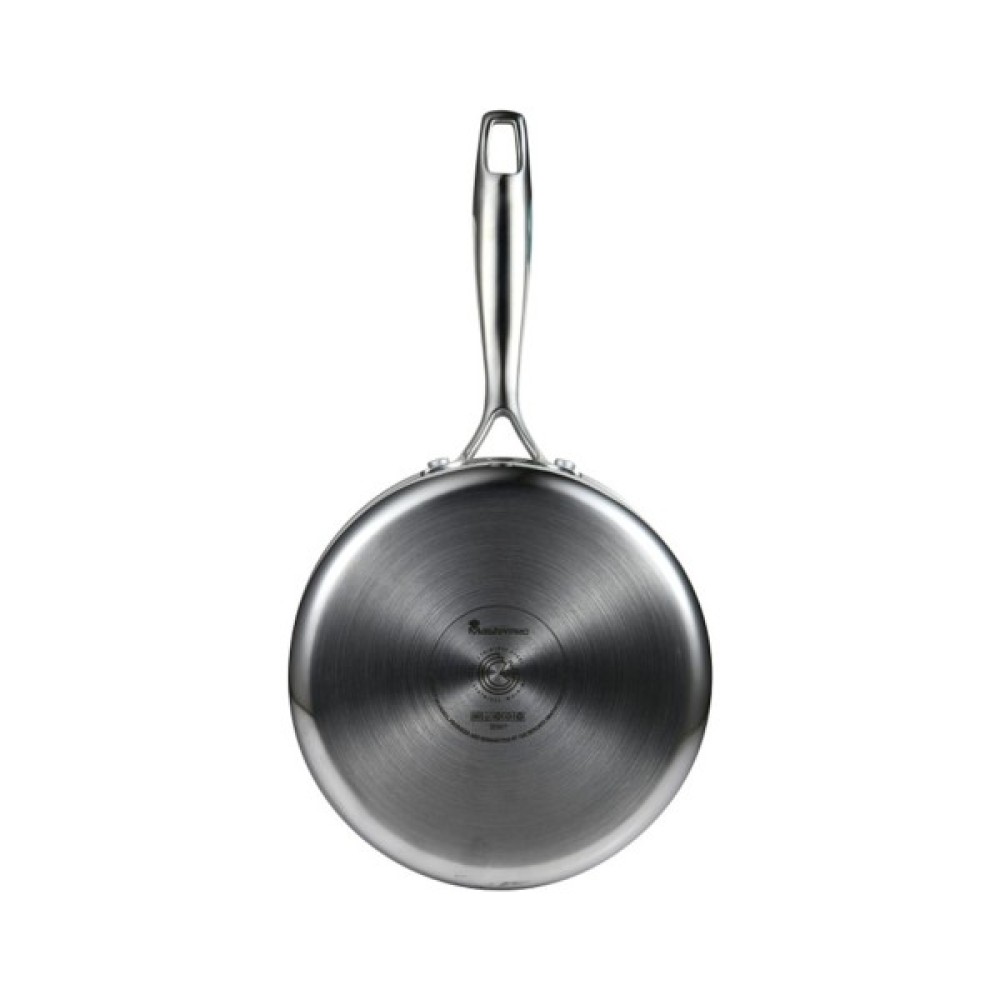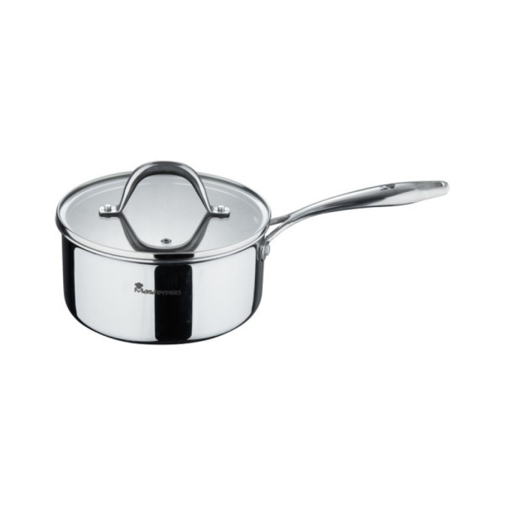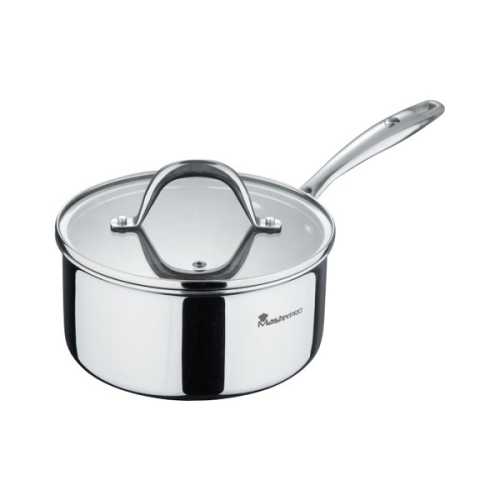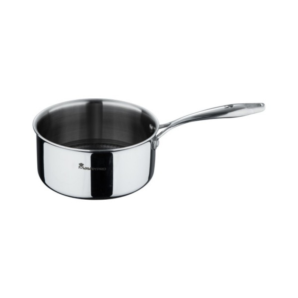 Цей ківш MasterPro Hi-tech 3 діаметром 22 см і висотою 10 см виготовлений із нержавіючої сталі 18/10, що гарантує рівномірний нагрів і тривалий термін служби. Ківш виконаний у чорному металічному кольорі, який додає йому сучасного вигляду. Оснащений кришкою з нержавіючої сталі, він забезпечує додаткову функціональність. Антипригарне покриття PPG ETERNA® спрощує процес очищення, хоча миття в посудомийній машині не рекомендується. Ківш підходить для всіх типів плит, включаючи індукційні.