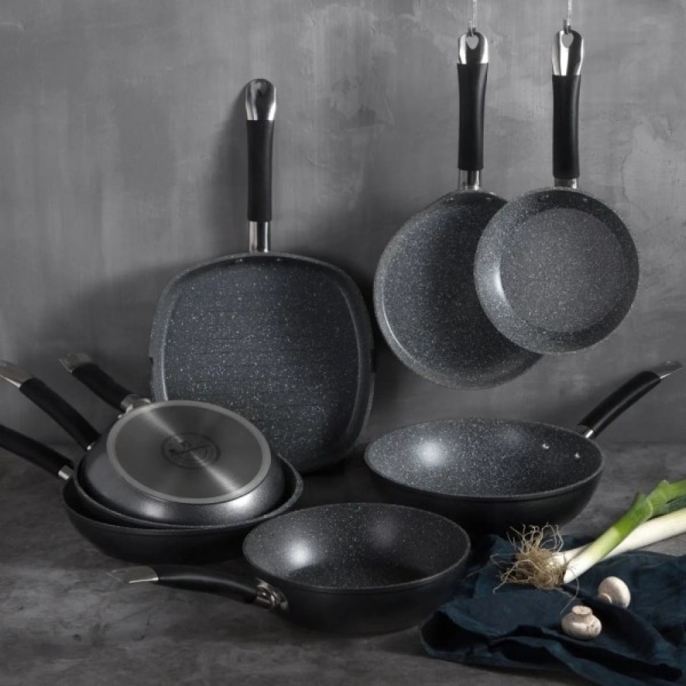 Руків'я сковорідок оснащені накладками з Soft Touch силікону, які забезпечують комфортне та безпечне захоплення під час приготування. Ці накладки не нагріваються і надають приємного на дотик відчуття, що підвищує рівень безпеки під час роботи з гарячими поверхнями.