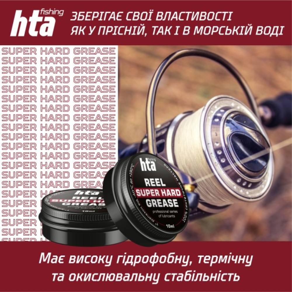 Консистентне мастило преміум якості HTA SUPER HARD GREASE для всіх видів рибальських котушок. 100% синтетичне багатоцільове мастило з нейтральним запахом і смаком.