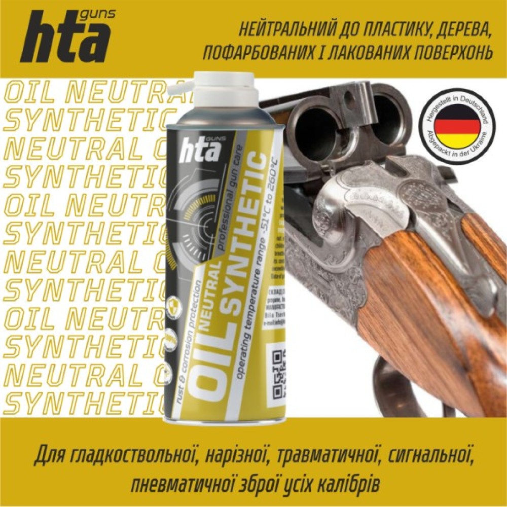 Нейтральне синтетичне мастило для зброї HTA Neutral Synthetic Oil 400 мл: Мастило застосовується для догляду та технічного обслуговування нарізної та гладкоствольної зброї. Підходить для мисливської, спортивної, бойової, сигнальної, антикварної зброї, дрібного та великого калібру. Засіб глибоко проникає в різьбові, шарнірні та штифтові з'єднання зброї та змащує їх. Безпечно для людини та навколишнього середовища, що підтверджується наявністю харчового допуску NSF Н2.