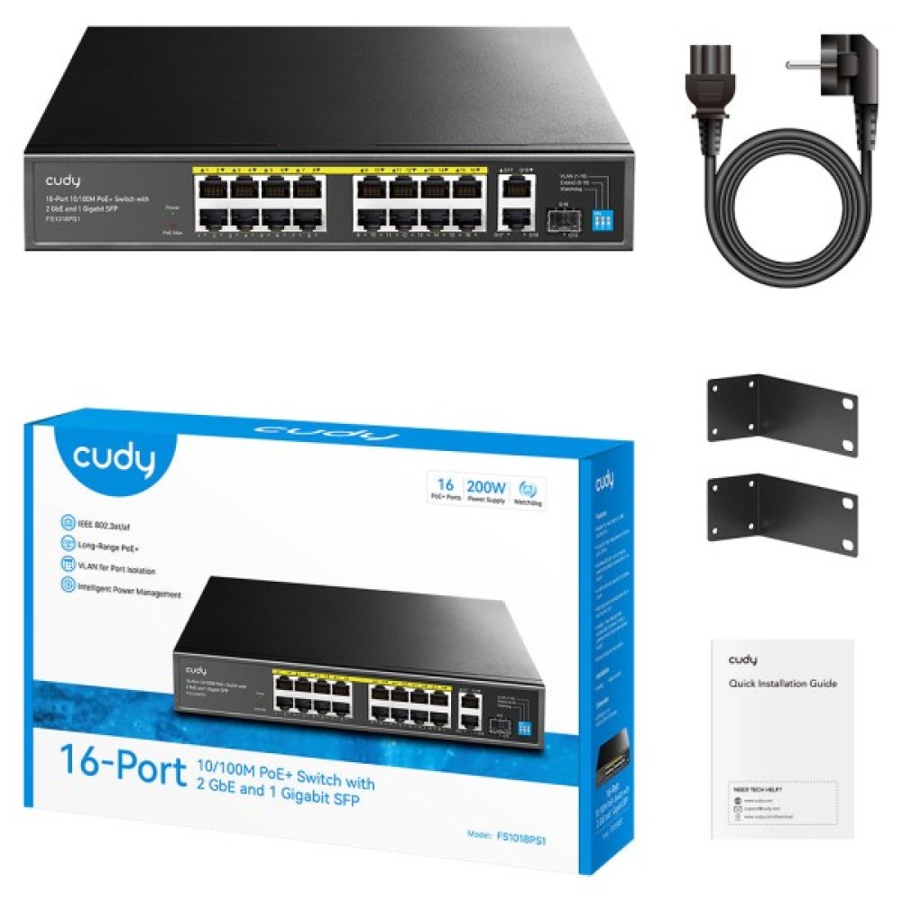 Комутатор Cudy FS1018PS1 з вбудованим блоком живлення 200 Вт - це ідеальне рішення для розширення мережі та живлення PoE-сумісних пристроїв. Він чудово підійде для організації систем відеоспостереження, IP-телефонії, розгортанні бездротових мереж та інших задач малого та середнього бізнесу.