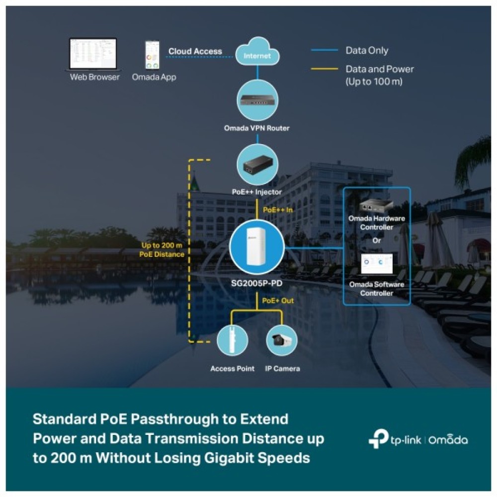 Усуньте обмеження місця доступу до мережі та передавайте дані та живлення за допомогою одного кабелю, що спрощує встановлення та скорочує витрати на розгортання. Подвійна відстань з'єднання PoE між пристроєм від 100 м до 200 м, що ідеально підходить для камер спостереження та точок доступу на великій відстані.