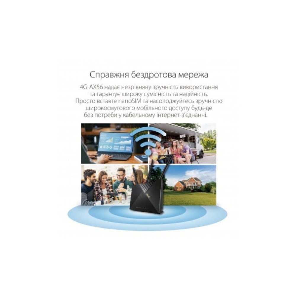 Вражаючи продуктивністю Wi-Fi, 4G-AX56 пропонує швидкість передачі даних до 1200 Мбіт/с, використовуючи новітні стандарти Wi-Fi 802.11 ax при частотах 2.4 ГГц і 5 ГГц. Це забезпечує безперебійну трансляцію відео, онлайн-ігри та перегляд веб-сторінок навіть у мережах з інтенсивним трафіком. Завдяки технологіям OFDMA та MU-MIMO, ваші пристрої отримують до 4-х разів більшу пропускну здатність і швидкість відгуку в порівнянні з попередніми технологіями Wi-Fi, що робить цей маршрутизатор ідеальним вибором для сімей з великою кількістю підключених пристроїв.