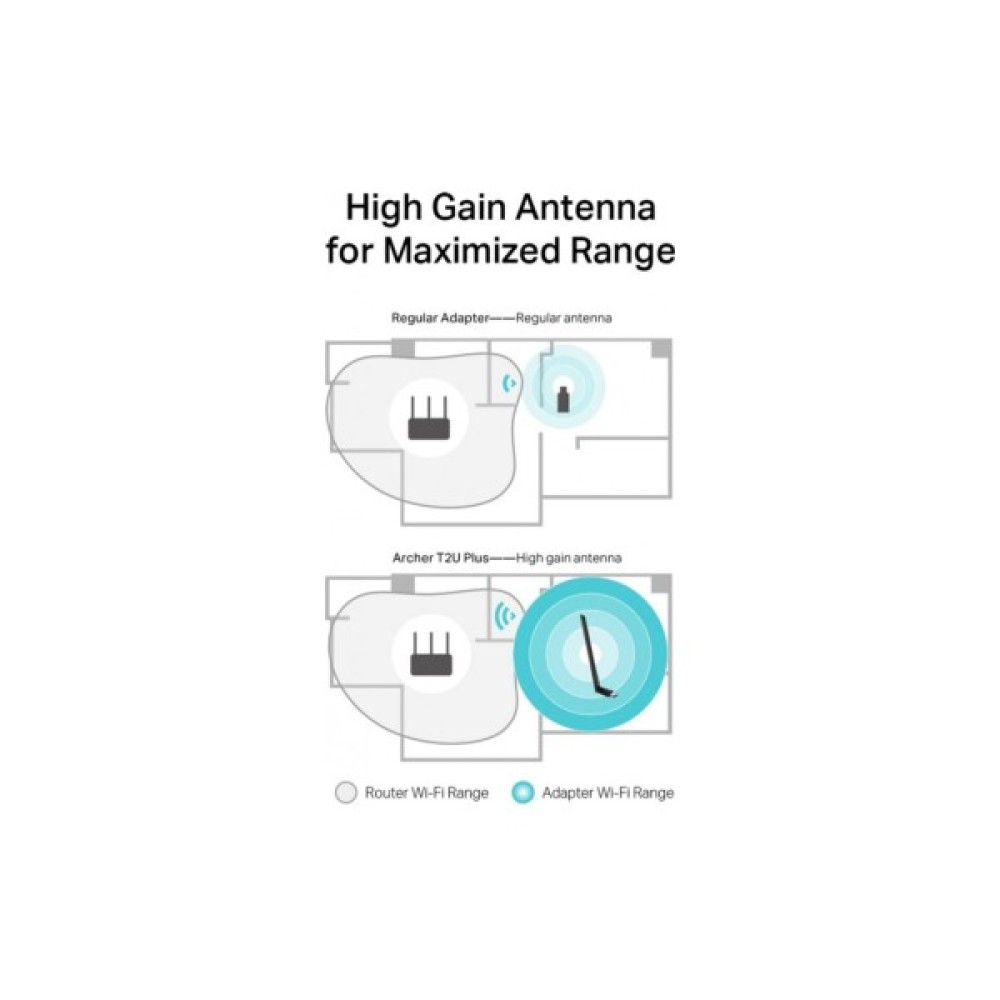 Archer T2U Plus обладнаний 5 дБі антеною високого підсилення для максимальної швидкості прийому і передачі сигналу. Використовуйте стабільний і надійний Wi-Fi по всьому будинку.