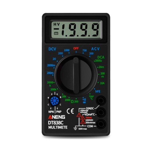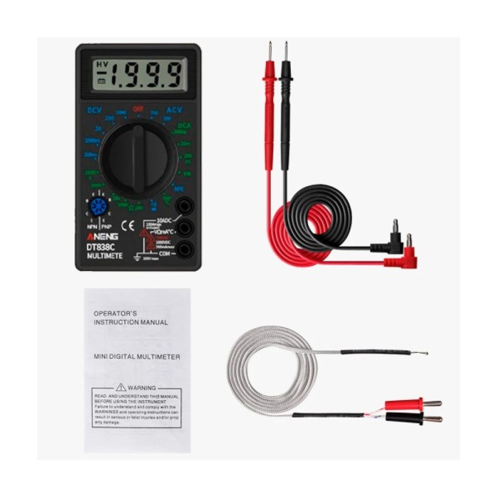 Мультиметр Aneng AN-DT838C - це універсальний та надійний пристрій для вимірювання DC/AC напруги, струму, опору та температури. Це невід'ємний інструмент для електриків, техніків та ентузіастів із обслуговування електронного обладнання. За допомогою цього мультиметра, ви можете швидко та точно виміряти різні електричні параметри, що дуже корисно при виявленні та усуненні несправностей у електричних ланцюгах та пристроях.