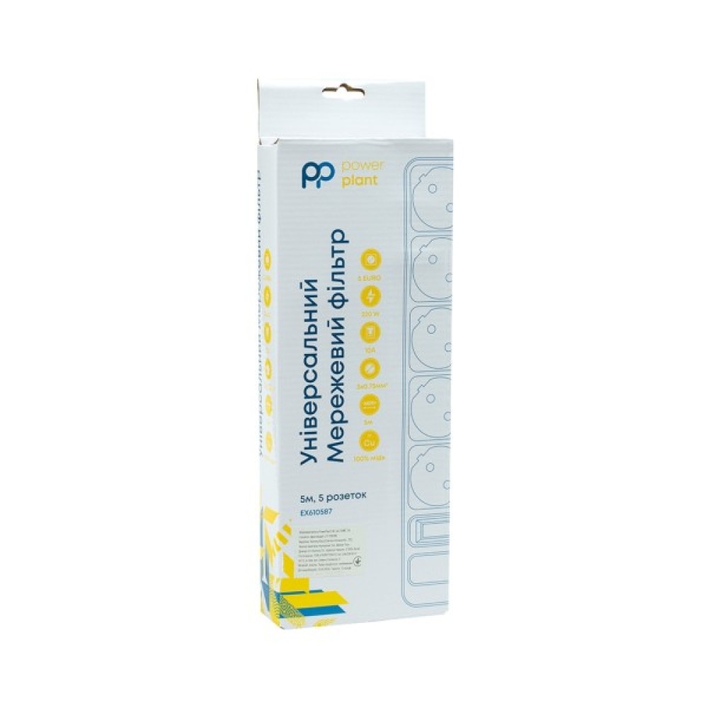 Мережевий фільтр PowerPlant (JY-1056/5B) на 5 розеток призначений для підключення широкого спектру комп'ютерної, побутової та електронної техніки до електричної мережі змінного струму з номінальною напругою не більше 250В та номінальним струмом не більше 10А. Кабель довжиною 5 м дозволить підключити техніку в місцях віддалених від стаціонарних розеток. Ізоляційний матеріал H05VV-F та провідники зі 100% міді гарантують високу стійкість до температур та механічних пошкоджень, а також максимальну електропровідність та стійкість до навантажень. Корпус мережевого фільтра виготовлений із вогнестійкого пластику. Фільтр оснащений універсальними розетками євростандарту із заземленням. Надійний та зручний подовжувач захистить електронну техніку від короткого замикання та перепадів напруги. Фільтр PowerPlant стане відмінним помічником у будинку, офісі або на дачі.