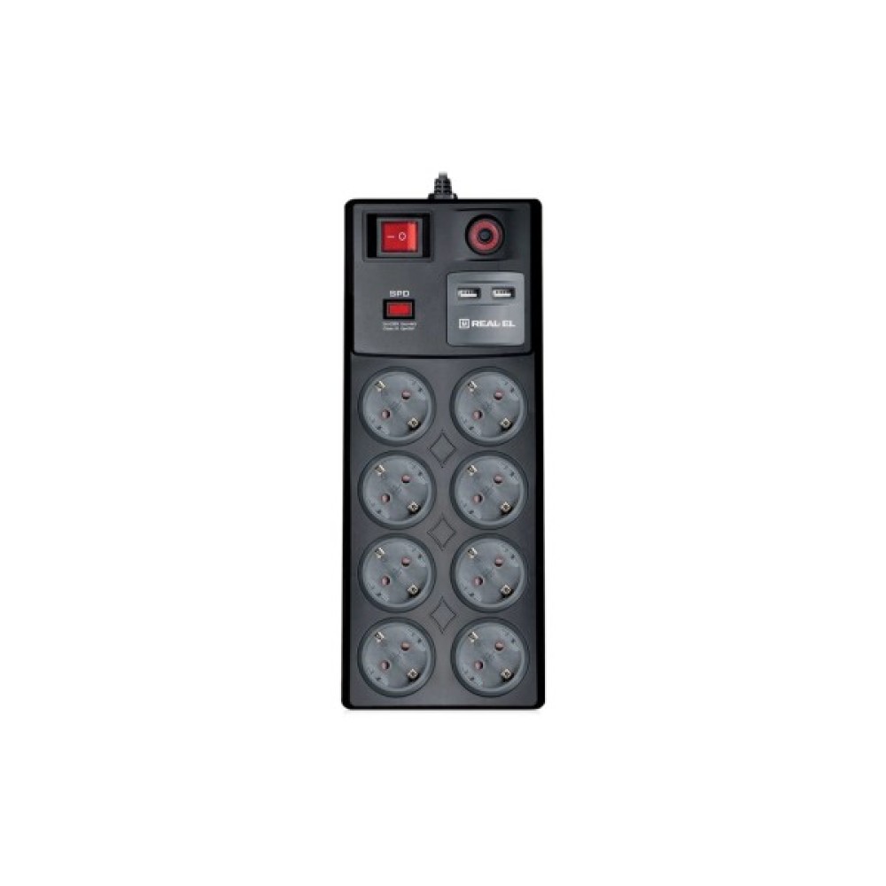 Мережевий фільтр-подовжувач REAL-EL RS-8F USB Charge із вбудованим USB зарядним пристроєм призначений для підключення до електричної мережі електроприладів та забезпечення їх захисту від високовольтних імпульсів напруги та постійної фільтрації високочастотних перешкод.