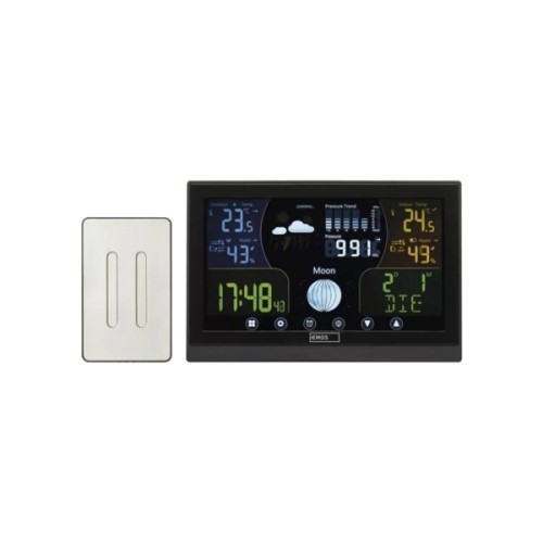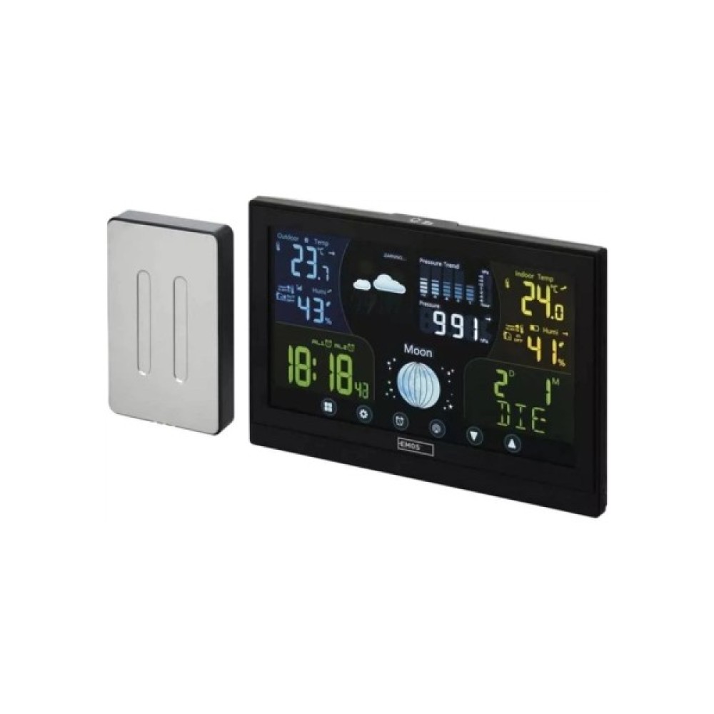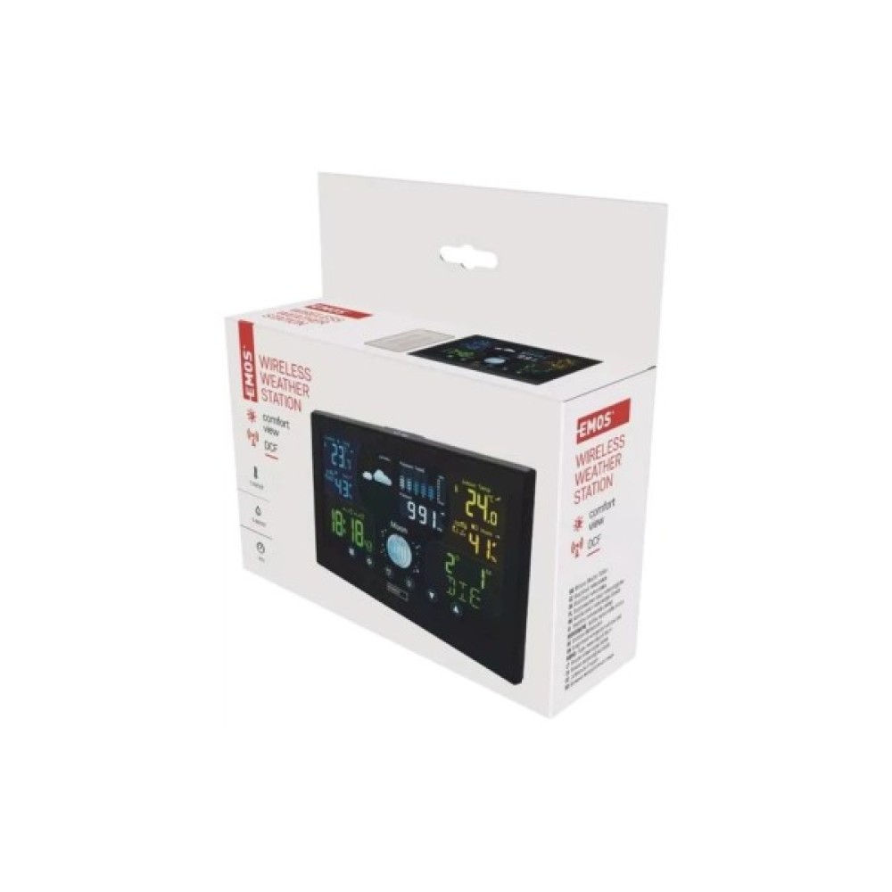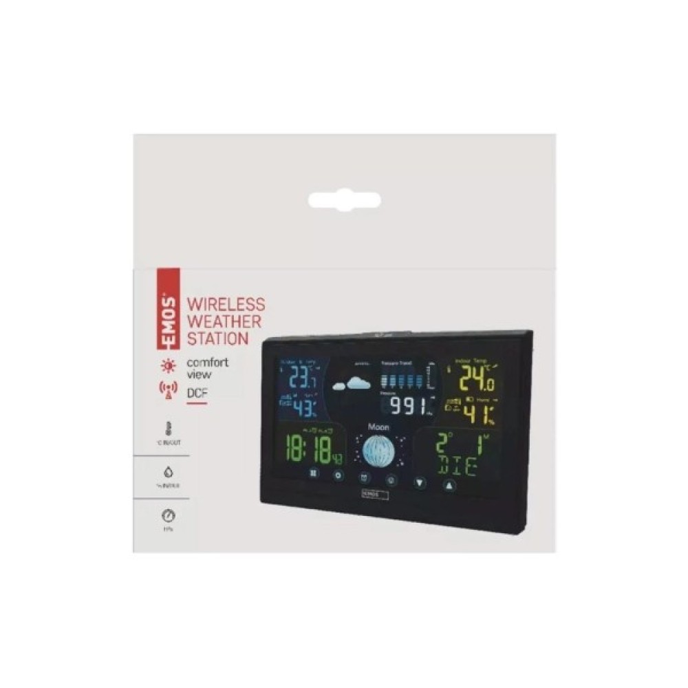 Бездротова метеостанція E6018 від чеського виробника EMOS. Метеостанція з чітким цифровим дисплеєм надає актуальну інформацію про поточний час, дату, температуру, вологість, атмосферний тиск, фази місяця й передусім прогноз погоди, доступний на наступні 12-24 години. Температура вимірюється як у приміщенні, і на вулиці.
