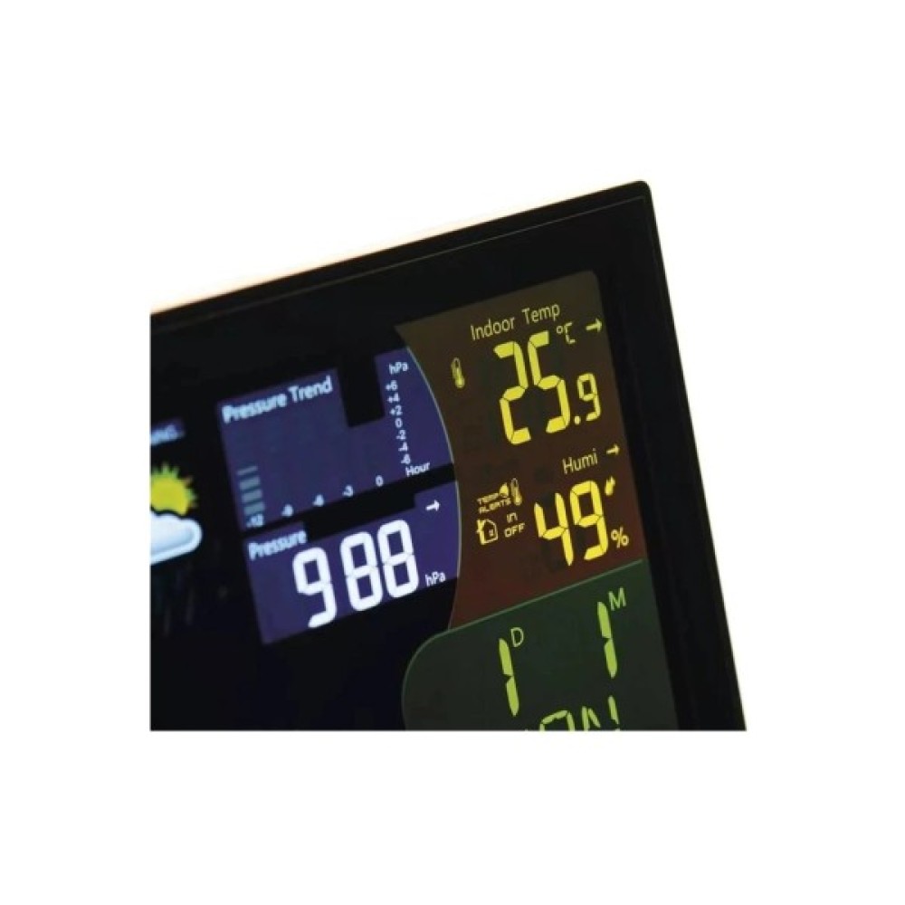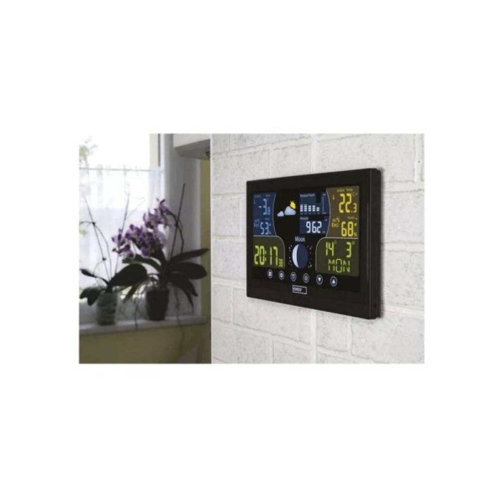 Метеостанція обладнана бездротовим погодостійким датчиком, з дальністю приймання сигналу до 100 м, може бути поєднана з такими 3 датчиками, і дані з них легко виводяться на дисплей. Одна з найбільших переваг цієї метеостанції — кольоровий дисплей із сенсорними кнопками та великим кутом огляду. Зручний режим налаштування яскравості, дисплей може працювати як від батарейок, так і від мережі.