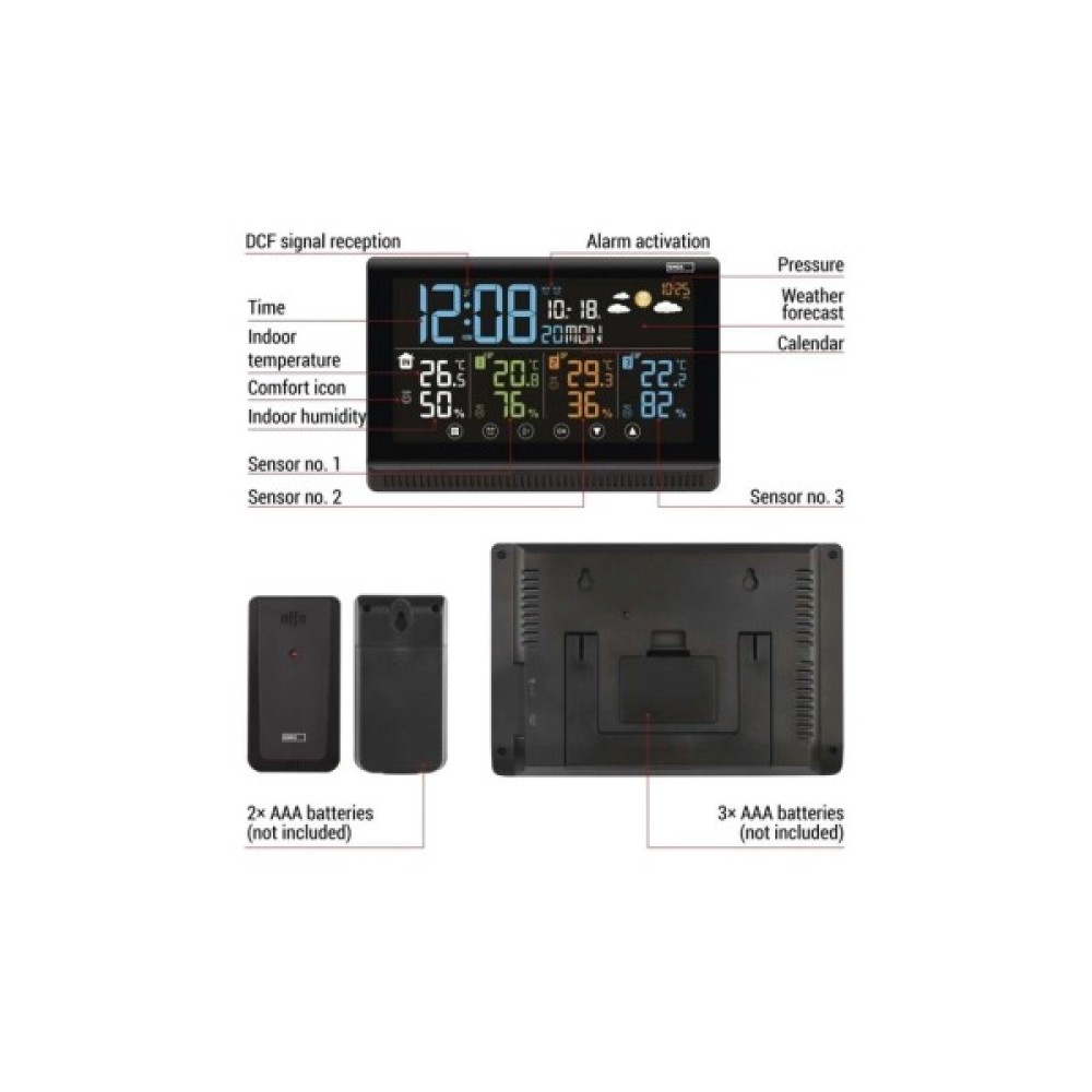 - Живлення станції: блок живлення 5 V DC/1 000 mA (в комплекті) + 3×1,5 V AAA (не входять до комплекту)