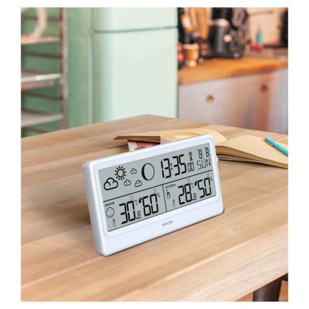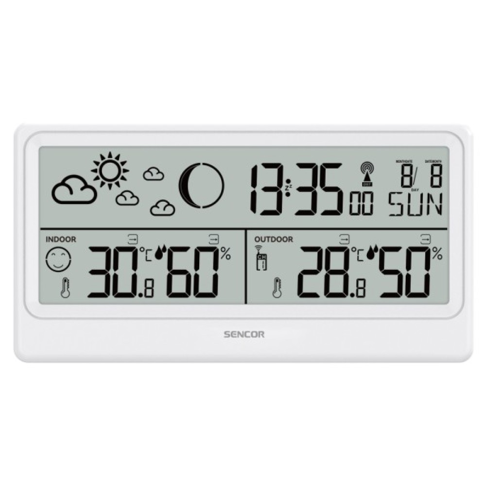 Sencor SWS3600 оснащена зручним інтерфейсом для зчитування температури та вологості в приміщенні, з індикатором комфорту та тенденції, а також для моніторингу зовнішньої температури та вологості з індикатором тренду. Завдяки радіокерованому годиннику за сигналом DCF77, Sencor SWS3600 автоматично синхронізує час, проте можливе також ручне налаштування. Вона відображає цифровий час, дату та день тижня, а також фазу місяця.