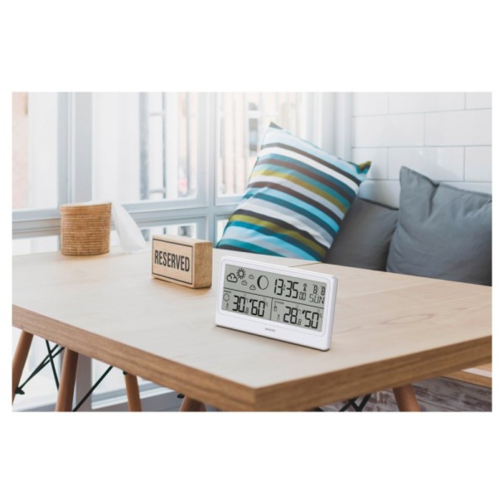 Додаткові характеристики відображення температури з °c/°f за вибором; фази місяця; можливість вибору 12- чи 24-часового формату; підтримує до 3 датчиків; годинник; прогноз погоди; цифровий час, дата та день тижня; температура та вологість у приміщенні; зовнішня температура та вологість; індикатор низького заряду батареї; індикація рівня комфорту (5 рівнів); автоматичне прокручування виміряних даних; функція відкладення; подвійна сигналізація; попередження про мороз для зовнішнього каналу; сповіщення про високу/низьку зовнішню температуру; попередження про ризик цвілі (3 рівні)