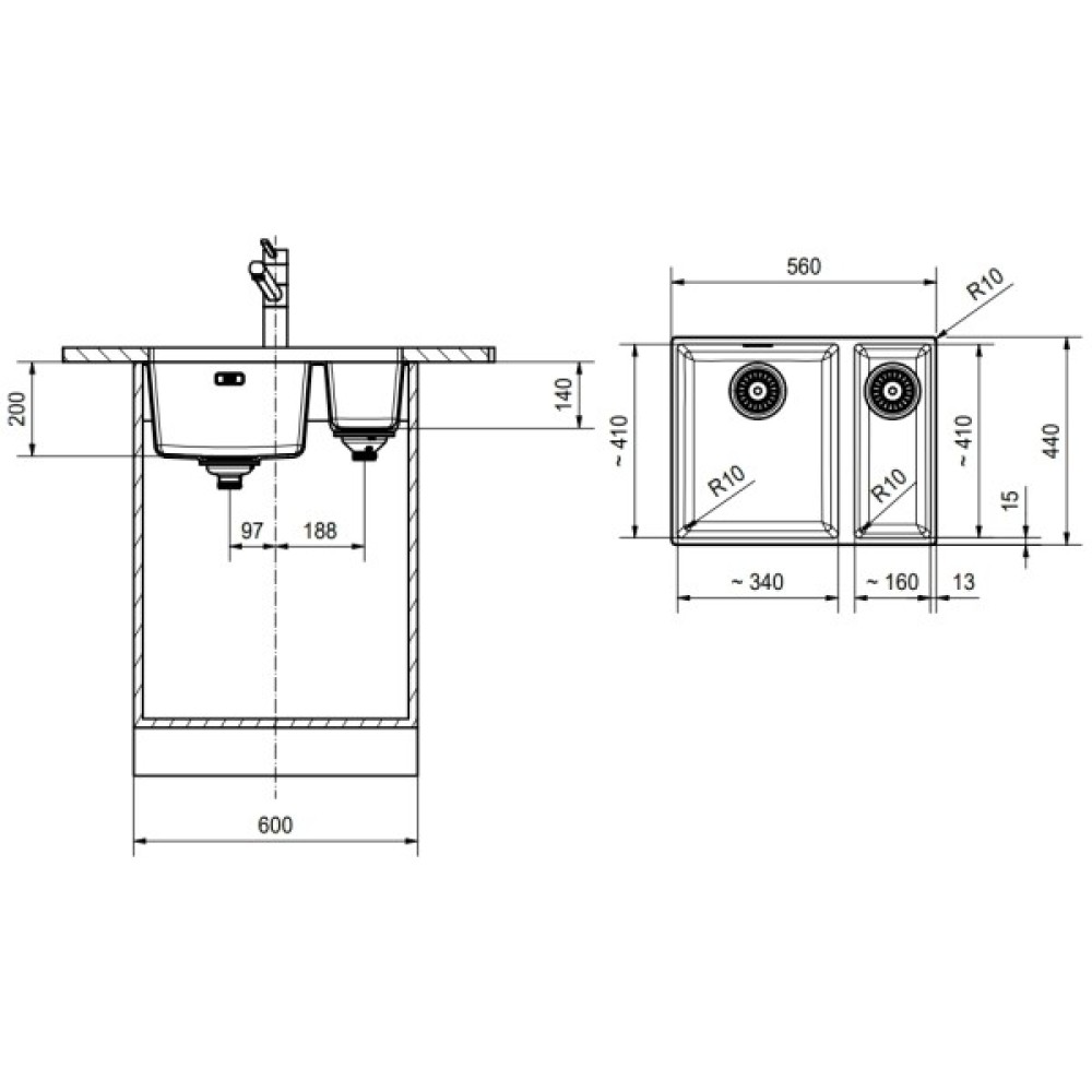 • Дві місткі чаші. Дозволяють одночасно мити овочі та посуд, підвищуючи ергономіку кухонного робочого простору.