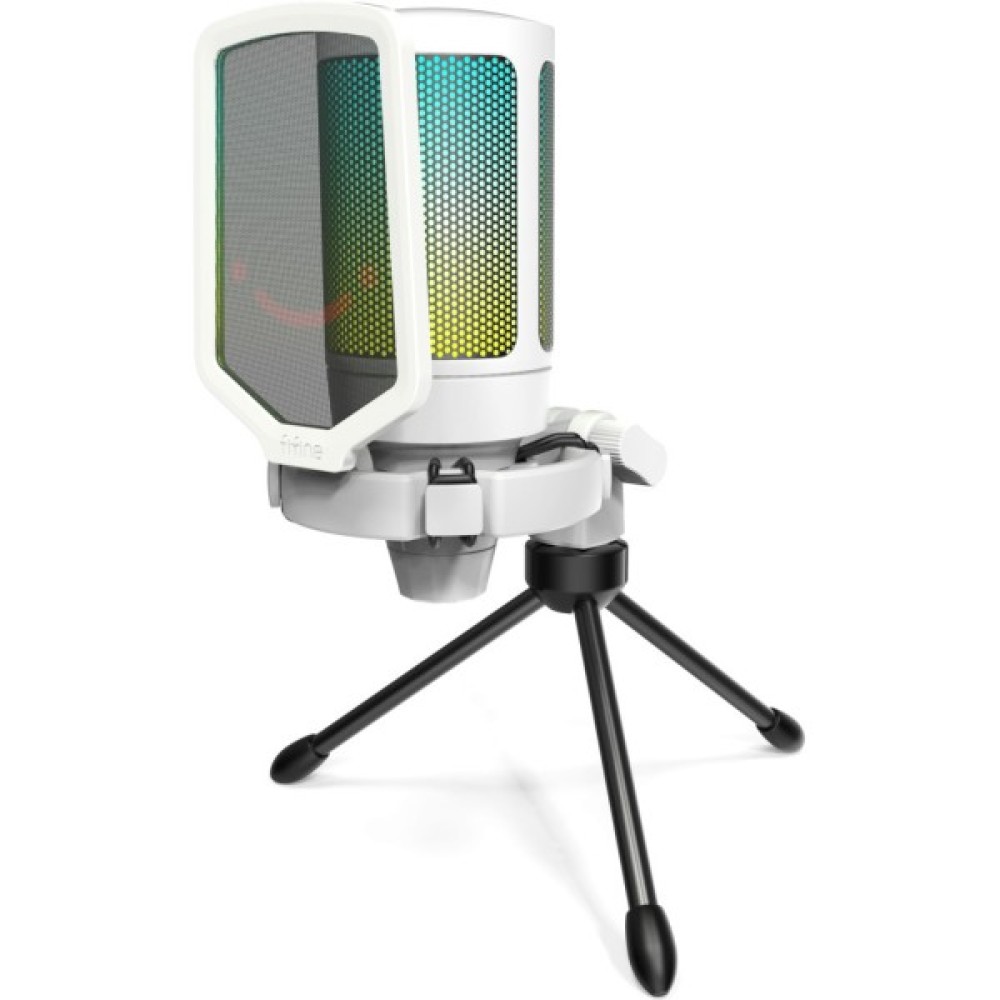 Fifine AmpliGame – якісний ігровий мікрофон з усіма необхідними аксесуарами, стане справжнім подарунком для досвідченого геймера. Якісний звук із глибокими низькими та чистими високими частотами, зручна тринога, вражаюче RGB-підсвічування, знімний поп-фільтр. Мікрофон працює на консолі Windows, Mac та PlayStation. USB порт розташований прямо за мікрофоном, що робить підключення зручнішим.