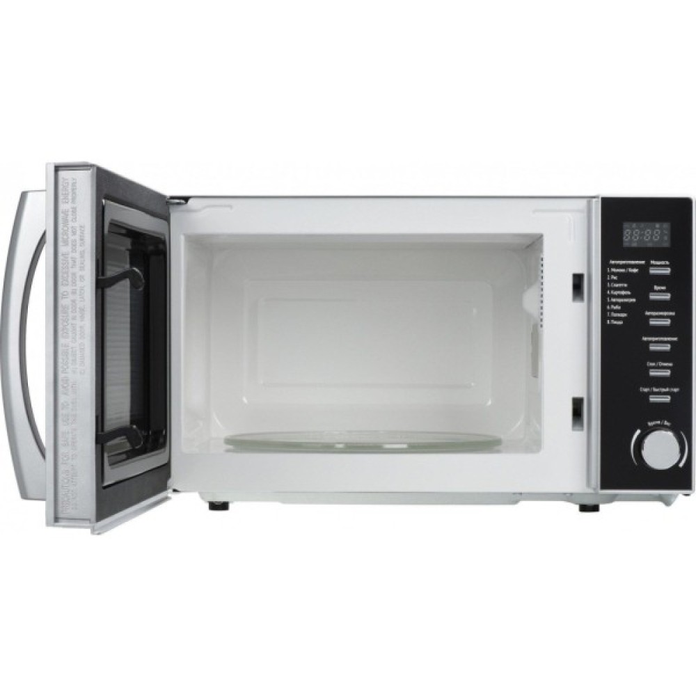 Підсвічування камери активується при відкритті дверцят та у процесі роботи, що дозволяє легко контролювати приготування їжі без зайвих зусиль. Важливою деталлю є поворотний скляний диск діаметром 255 мм, який забезпечує рівномірний розподіл мікрохвиль та дозволяє зберігати якість продуктів без зайвих витрат енергії.