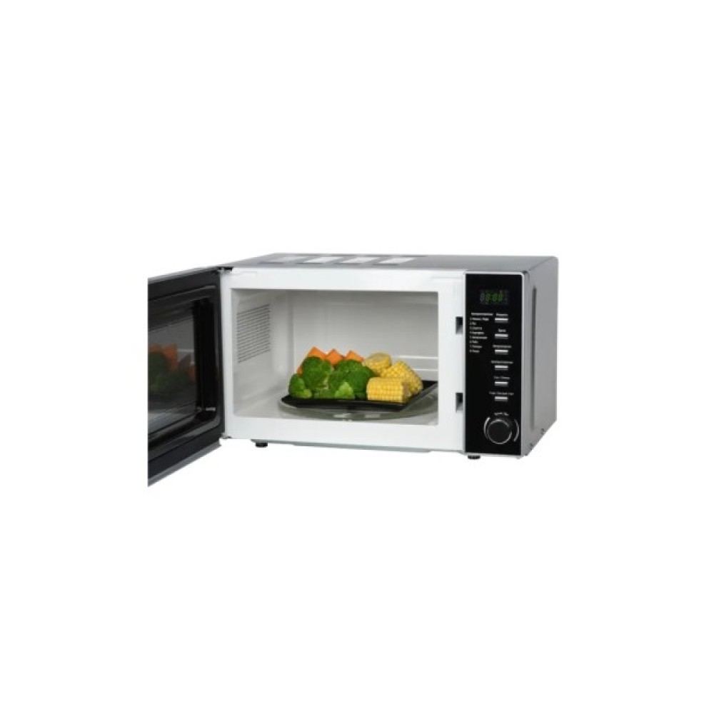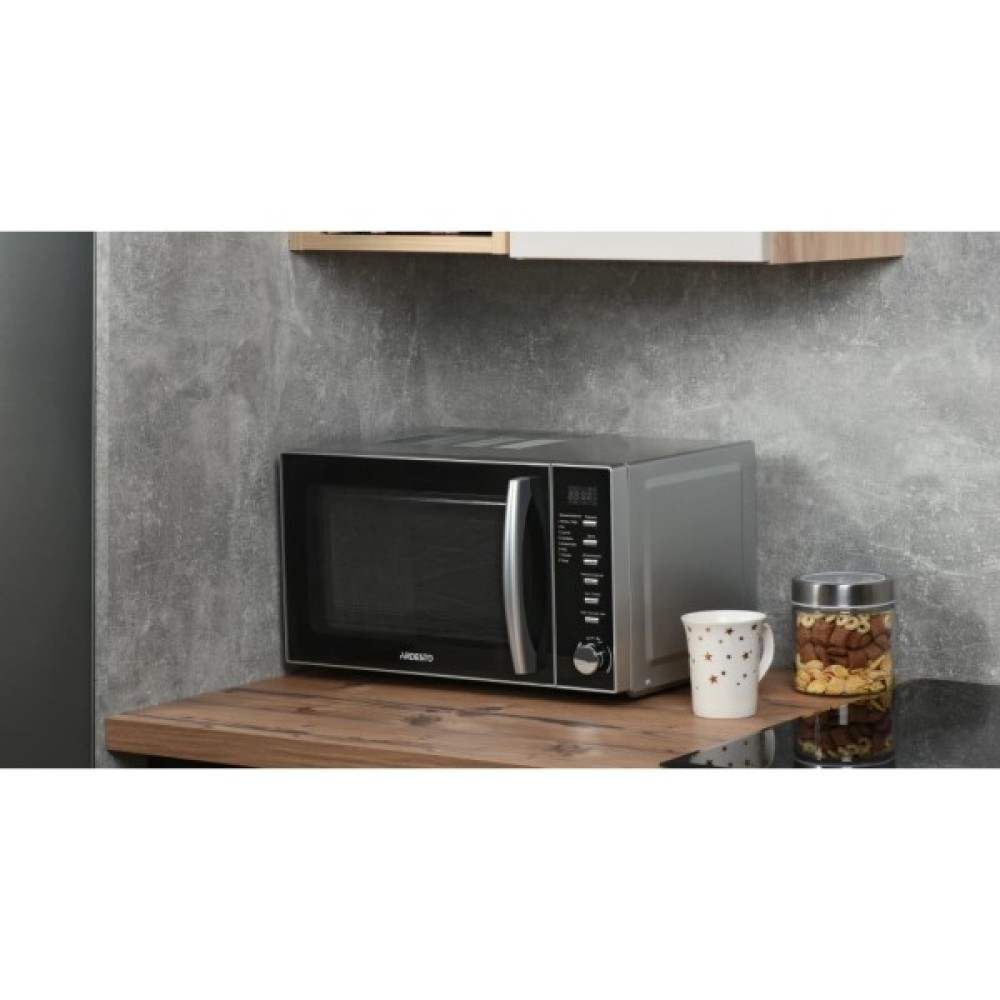 Дизайн мікрохвильової печі відзначається простотою та елегантністю: поєднання сріблястого та чорного кольорів гармонійно вписується у будь-який інтер'єр кухні. З зручними габаритами (ширина – 45.2 см, глибина – 34.5 см, висота – 26.2 см) вона не займе багато місця на вашій кухонній поверхні. Тип відкриття дверцят з ручкою забезпечує додаткову зручність у повсякденному використанні.