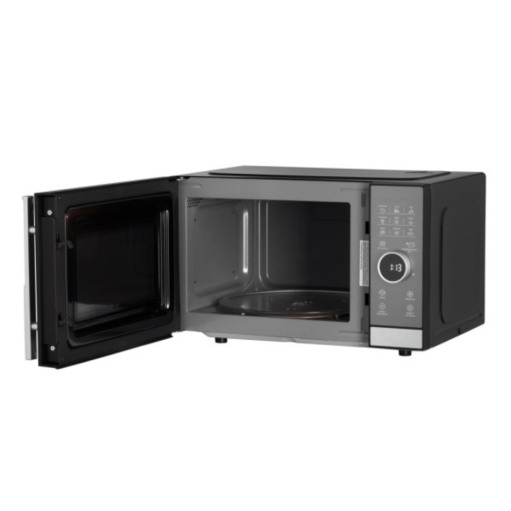 Зручність у використанні підкреслюється наявністю дисплея, де відображаються всі налаштування і час. Піч має руків’я для плавного відкривання дверцят, що додає комфорту під час експлуатації. Діаметр поворотного піддону у 285 мм дозволяє готувати на великій тарілці, що особливо практично під час сімейної вечері чи прийому гостей.