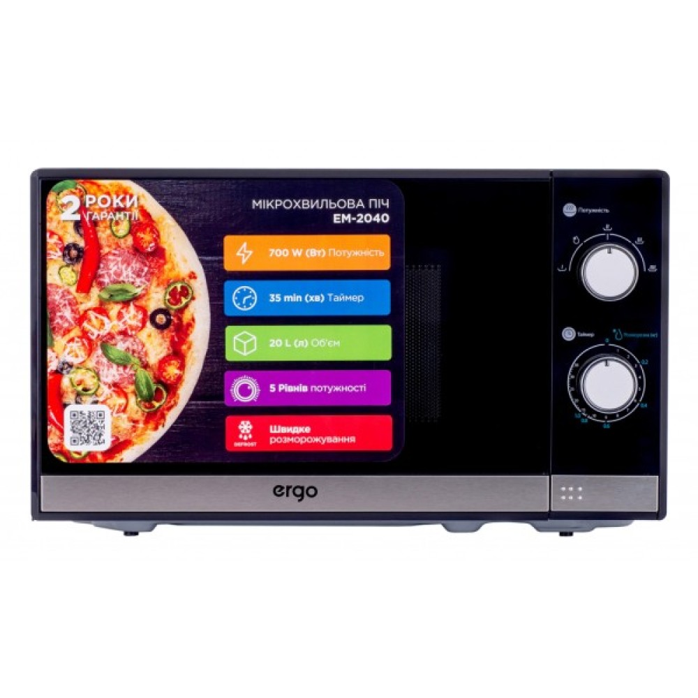Мікрохвильова піч Ergo EM-2040 - досконалий вибір для тих, хто цінує функціональність, стиль та комфорт на своїй кухні. Цей прилад стане незамінним помічником, адже поєднує в собі простоту використання та елегантний дизайн.