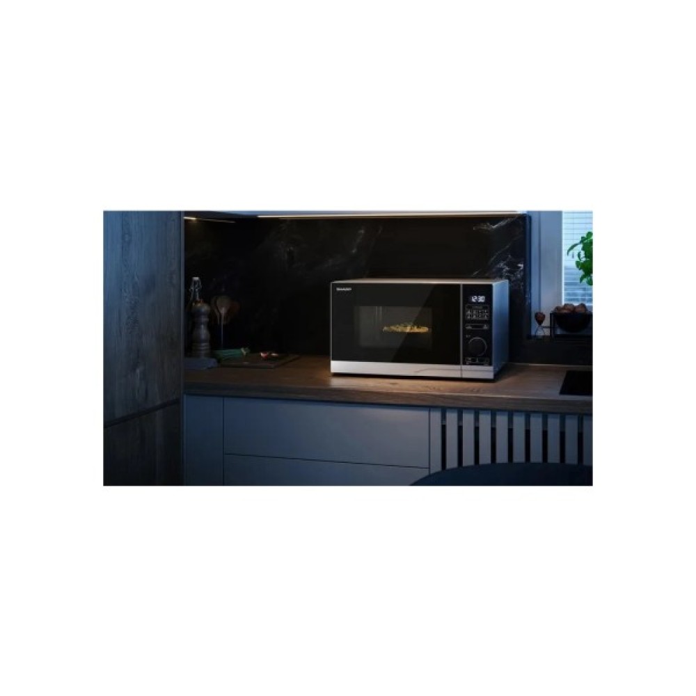 Sharp YC-PS234AE-S відзначається механічним керуванням, що робить її інтуїтивно зрозумілою у використанні, а кнопкове відкриття дверцят додає зручності в експлуатації. Дизайн печі вражає елегантністю – чорні скляні дверцята у поєднанні зі сріблястим корпусом доповнять будь-який інтер'єр, привносячи в нього нотки сучасності та стилю.