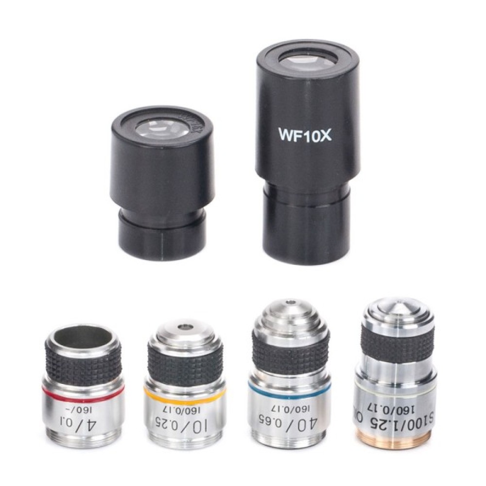 - Об'єктиви: ахроматичні 4x, 10x, 40x(s), 100x(s, oil)