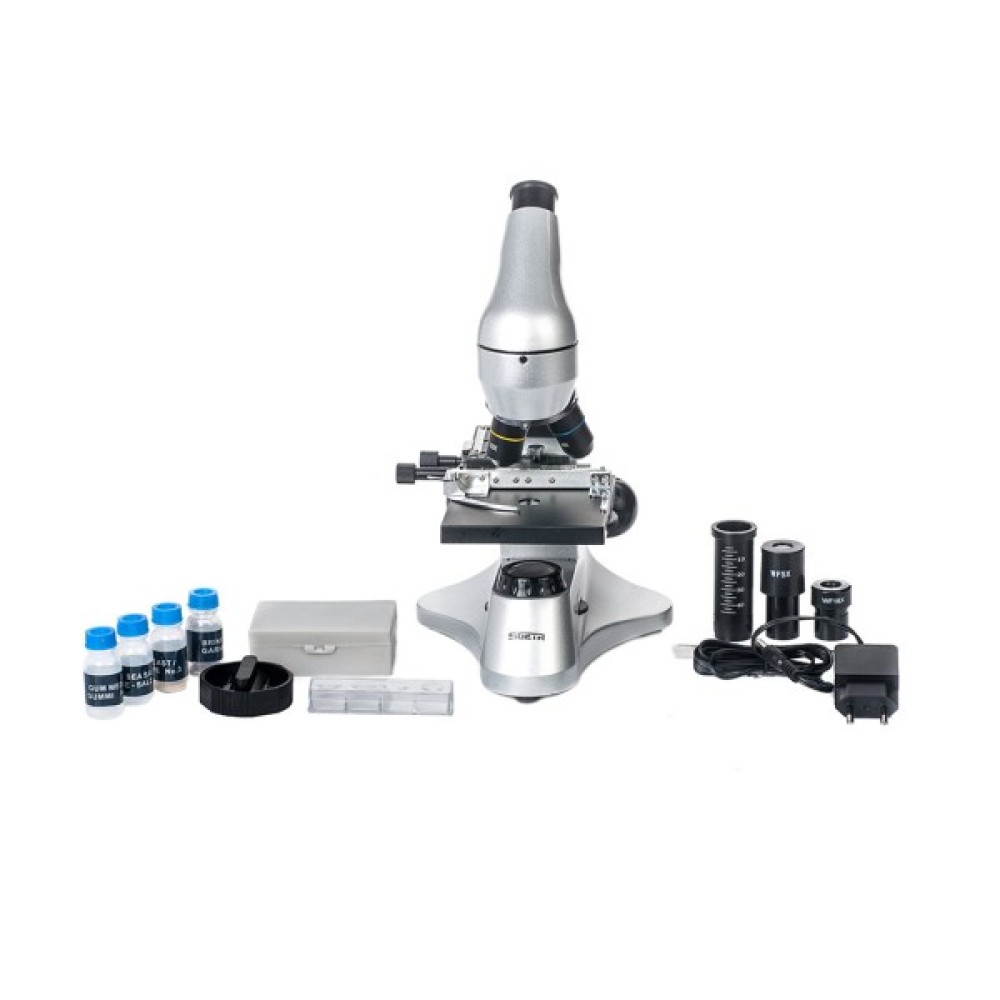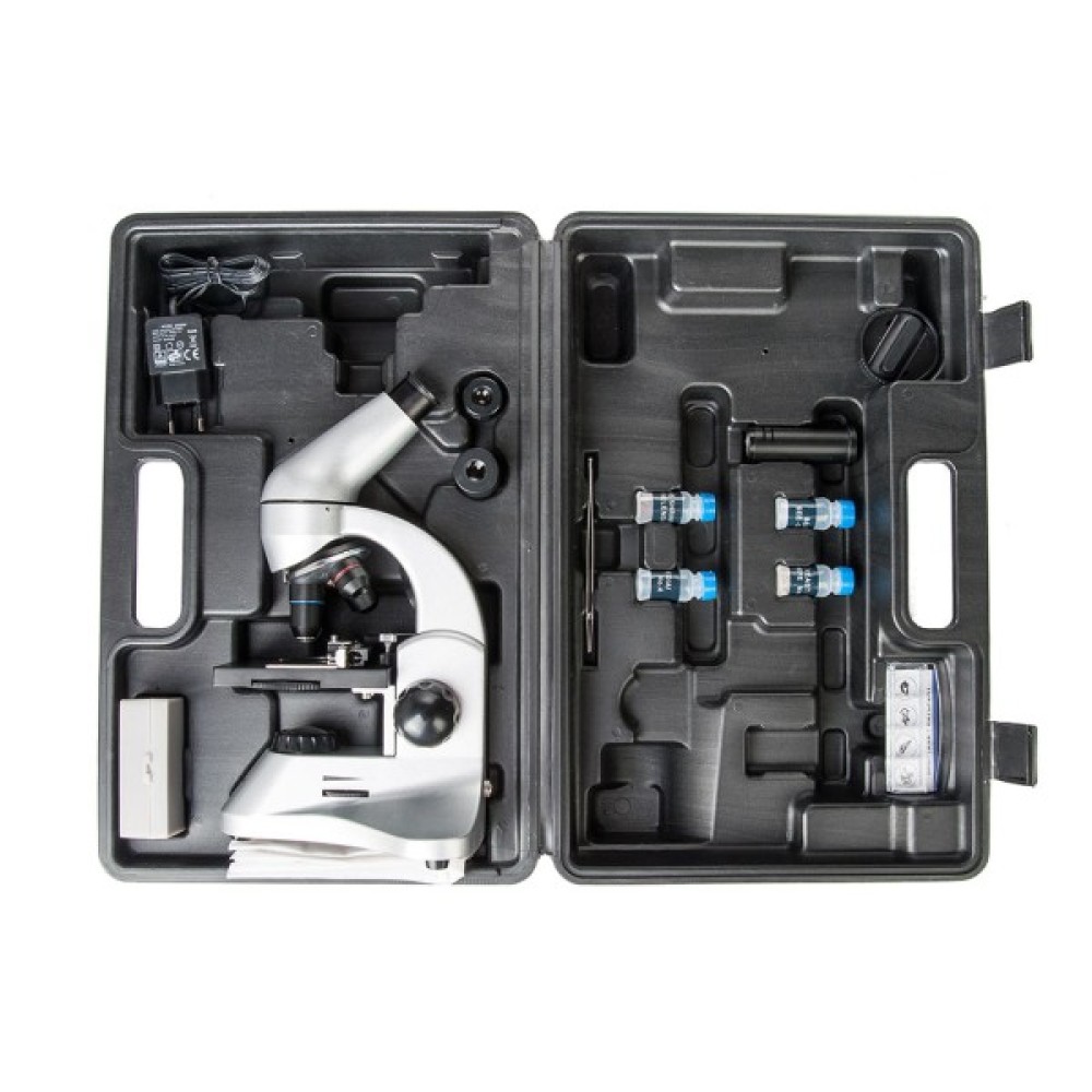 У комплект мікроскопа входить набір готових зразків і аксесуарів для досліджень. Вельми помірна ціна, багата комплектація і якісна оптика робить модель лідером з-поміж мікроскопів аналогічного класу.