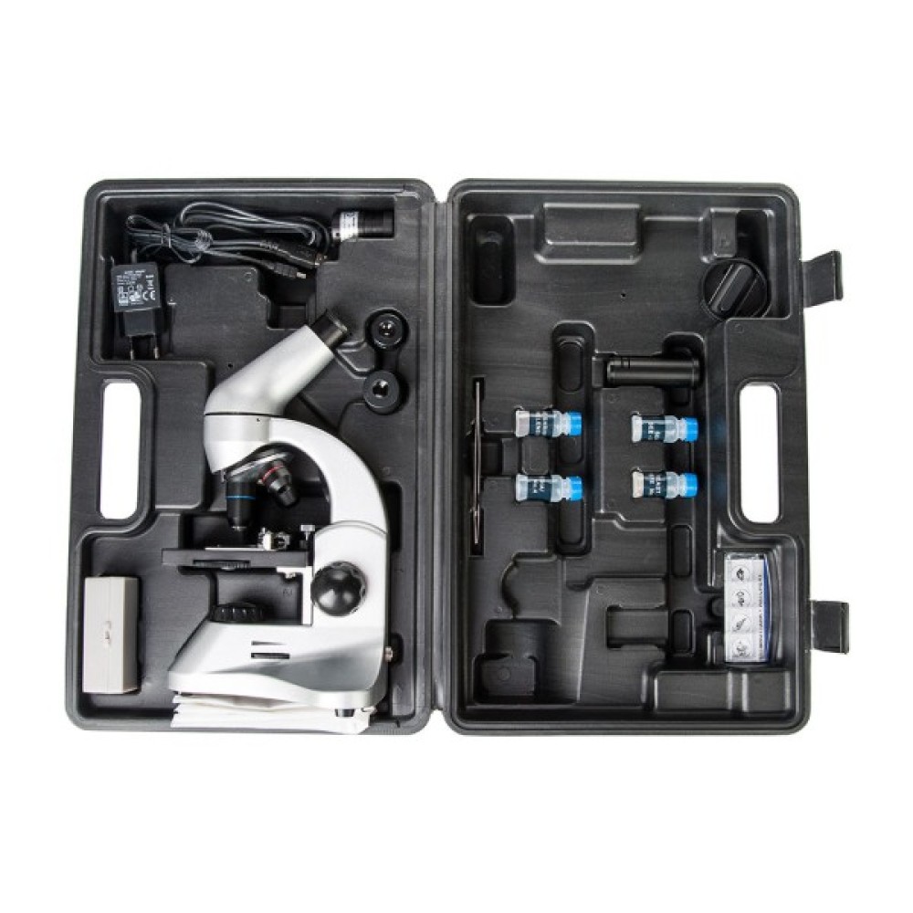 У комплект мікроскопа входить набір готових зразків і аксесуарів для досліджень. Вельми помірна ціна, багата комплектація і якісна оптика робить модель лідером з-поміж мікроскопів аналогічного класу.