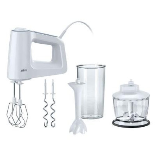 Міксер BRAUN HM 3135 WHITE виготовлений в білому кольорі. Кнопки управління розташовані зверху, на ручці для утримання. Мережевий шнур приєднаний ззаду. Ручка велика і зручна, дозволить триматися двома руками. Якщо ви любите смачно і швидко готувати, то модель міксера, представленого тут, буде відмінним помічником. Насолоджуйтеся якістю роботи і довговічністю, які будуть радувати вас день у день. Потужність представленої моделі міксера BRAUN HM 3135 WHITE становить 500 ват, що відмінно підійде для виконання будь-якої кухонної роботи. У комплекті є мірну склянку для виміру продуктів. Також міксер укомплектований віночком, гаками для тесту, подрібнювачем на 500 мілілітрів і блендером.