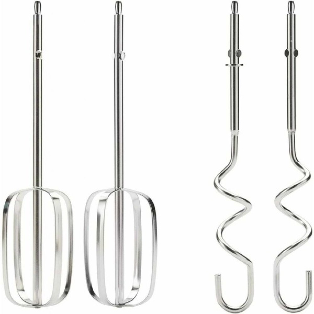 Міксер оснащується парою стандартних металевих віночків для збивання, парою гаків для замішування тіста та легкою чашею із білого пластику. Високі стінки чаші майже виключають розбризкування вмісту навіть при обробці продуктів у турборежимі. Щоб швидко замінити насадки, натисніть кнопку в передній частині рукоятки. Під час роботи насадки надійно фіксуються у пазах та гарантовано залишаються на місці за будь-якої швидкості обертання.