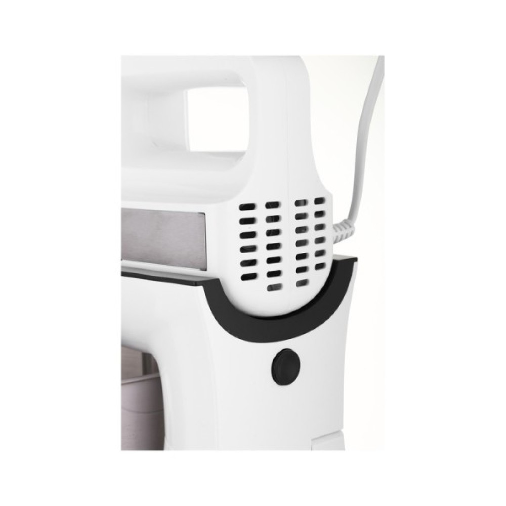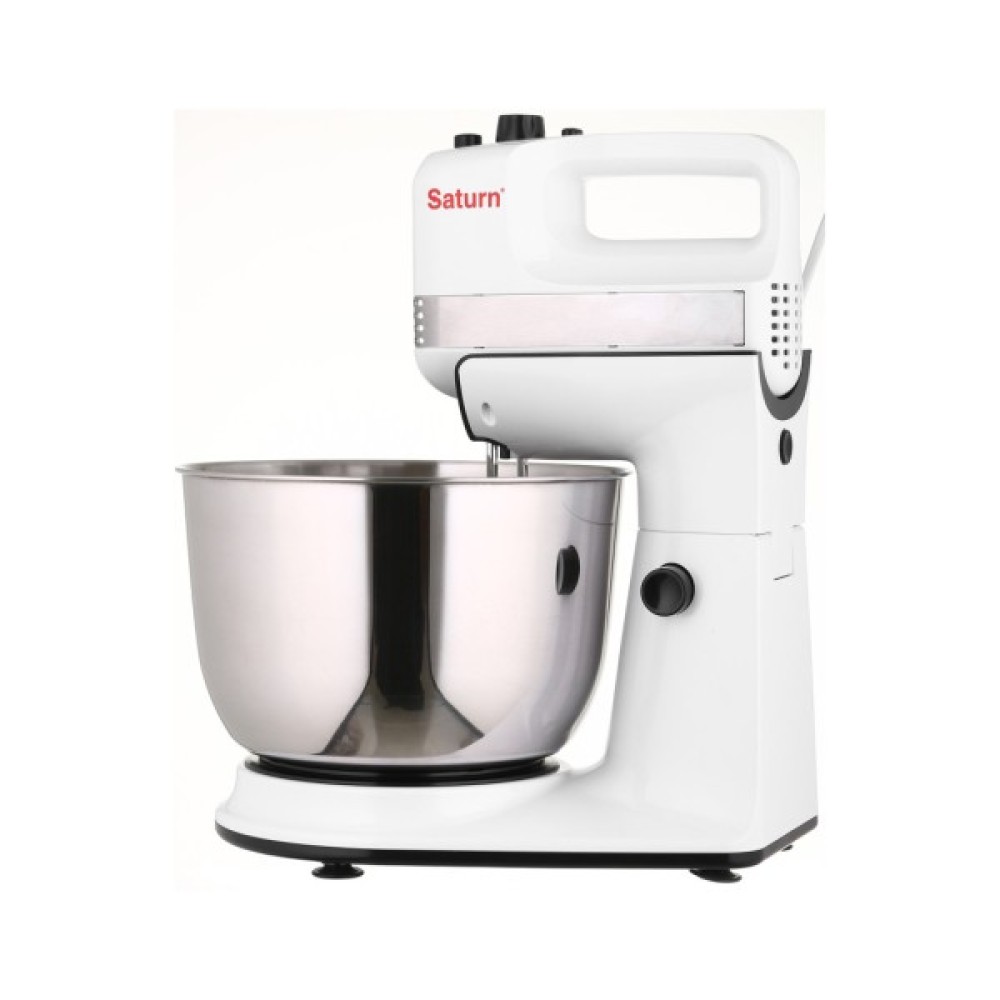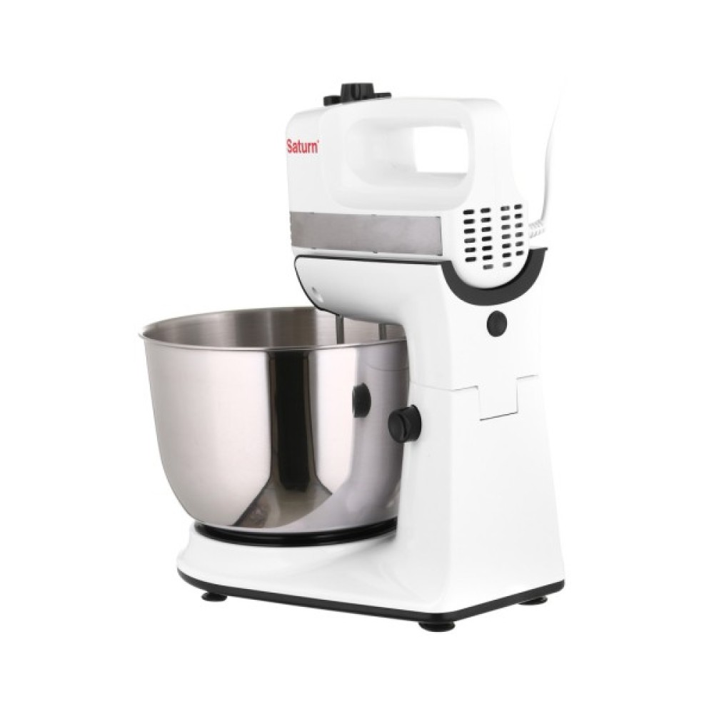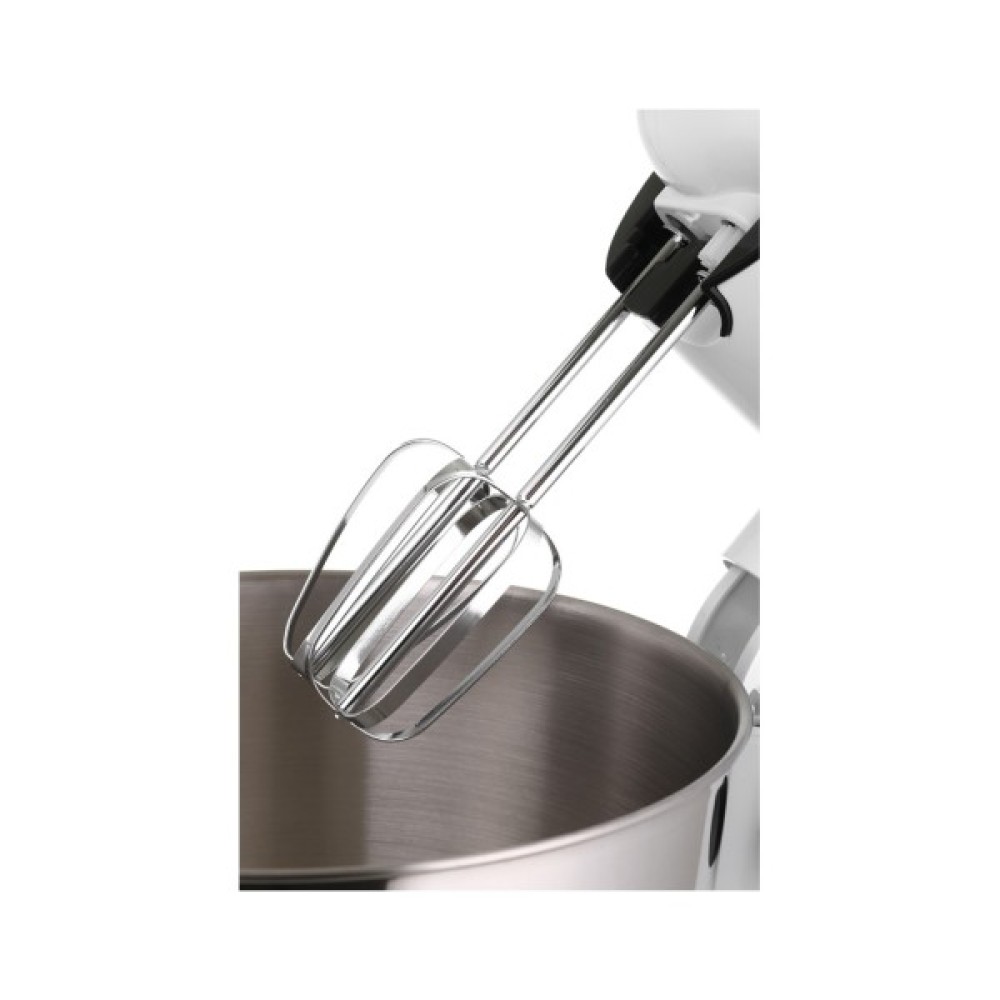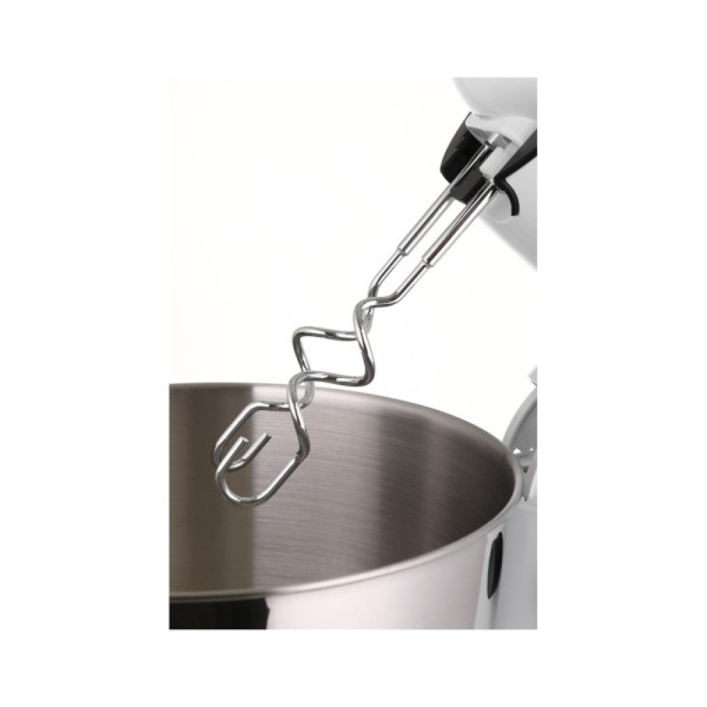 Стаціонарний міксер, потужність 300 Вт, 12 швидкостей, турбо режим, чаша з нерж. сталі – 4 л, обертання чаші, віночки для збивання, гаки для тесту, кнопка від'єднання насадок.