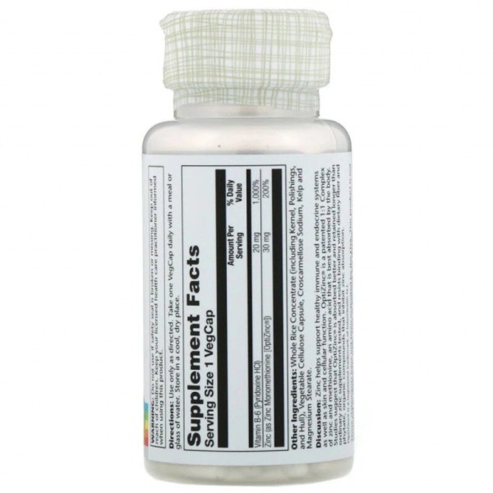 OptiZinc® від Solaray - це форма цинку з вітаміном B-6 в комплексі з амінокислотою метіонін. Дослідження показали, що цей запатентований комплекс 1:1 цинку і метіоніну (амінокислота, яка найкраще засвоюється організмом) довше і краще утримується в порівнянні зі звичайними цинковими добавками. Він перешкоджає зв'язуванню з харчовими волокнами і фітатами, органічними сполуками, які інгібують абсорбцію цинку.