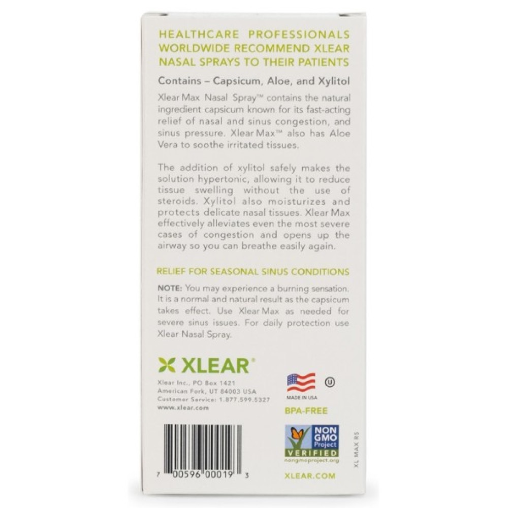 Xlear Макс сольовий назальний спрей — це натуральний засіб, який не викликає звикання. Рекомендується використовувати до зникнення симптомів. Для щоденного використання рекомендується звичайний Xlear натуральний сольовий назальний спрей із ксилітом.