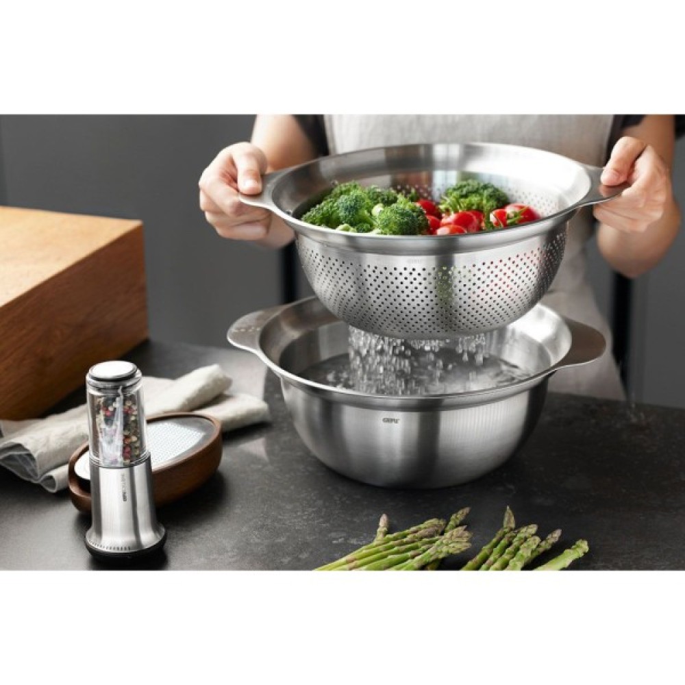 Виготовлена з нержавіючої сталі, миска GEFY Premio забезпечує високу міцність і довговічність. Цей матеріал відомий своєю здатністю протистояти корозії та зберігати свій первісний вигляд навіть після тривалого використання. Завдяки цьому, миска ідеально підходить для щоденного використання, витримуючи всі виклики сучасної кухні.