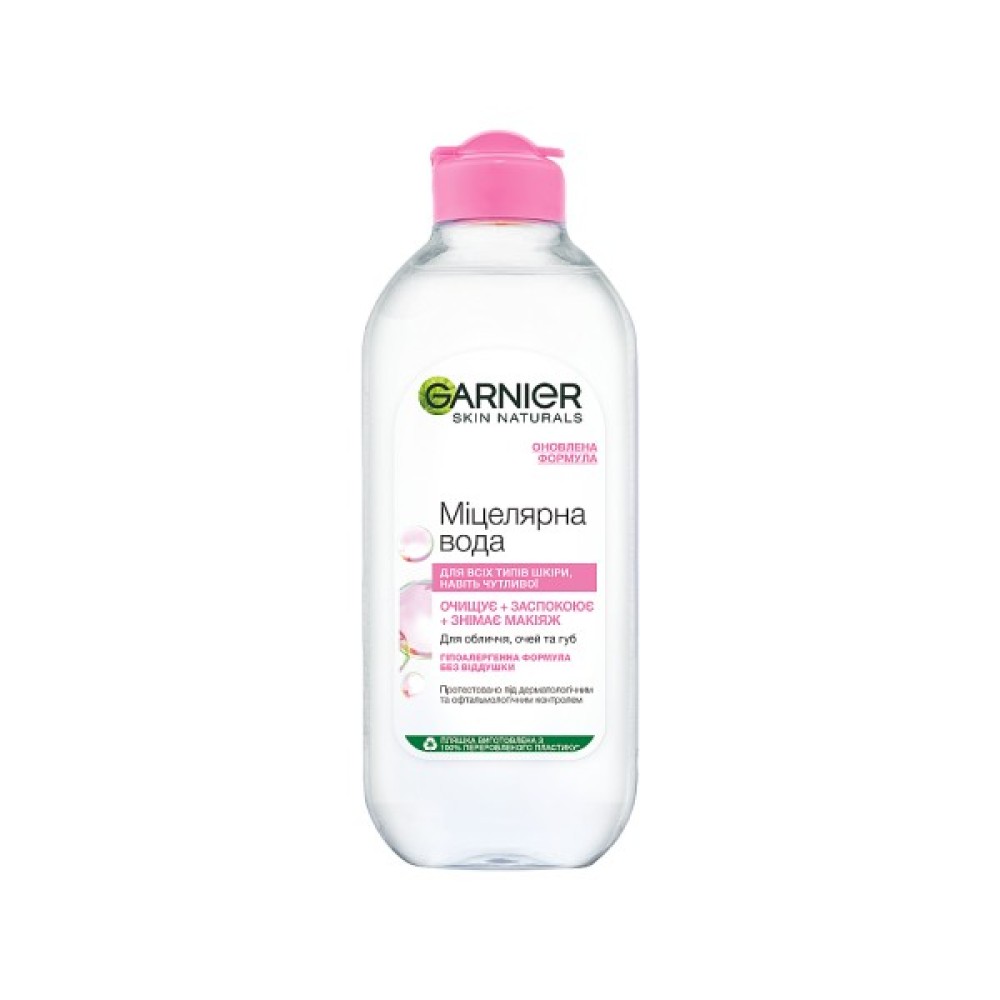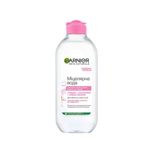 Міцелярна вода для всіх типів шкіри Garnier Skin Naturals з легкістю видаляє макіяж з обличчя, очей і губ, очищає шкіру без зайвого тертя й заспокоює її. До складу цього засобу входять мікрочастинки міцели, спроможні ніжно захоплювати забруднення і шкірний жир із поверхні шкіри, утримуючи їх усередині себе. У такий спосіб забезпечується максимальний комфорт у використанні.