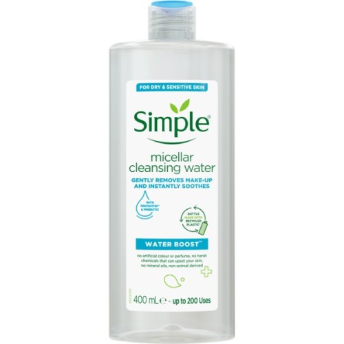 Міцелярна вода Simple ніжно змиває макіяж та миттєво заспокоює шкіру. Підходить для сухої та чутливої шкіри. Продукту вистачає на 200 використань.