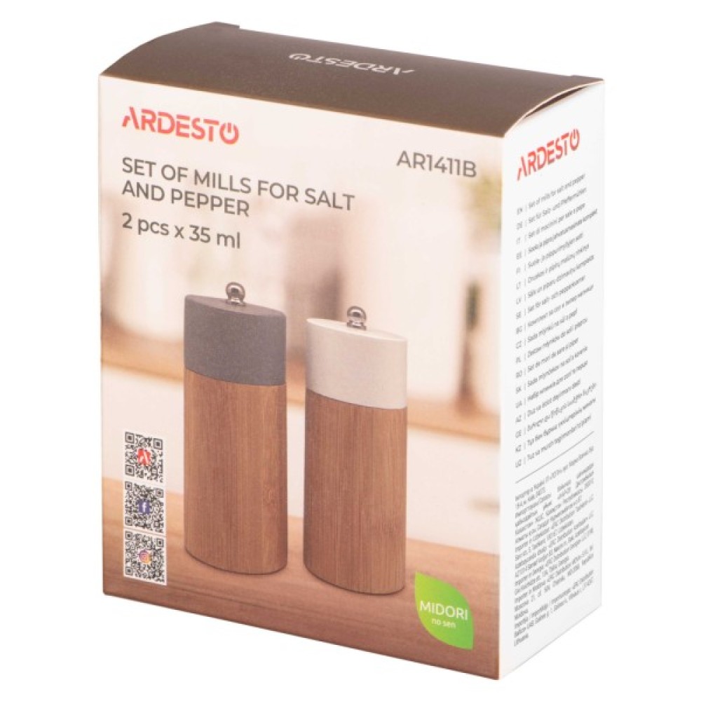 Млинки для солі та перцю ARDESTO серії Midori об’ємом 35 мл – це стильний і практичний вибір для щоденного користування. У наборі два предмети, які виготовлено з бамбука – екологічного матеріалу, якісної нержавіючої сталі та міцного пластика, що зумовлює їх довговічність. Робота млинків здійснюється вручну шляхом обертання рухомої частини. Гострі керамічні леза, якими оснащено вироби, забезпечують необхідний помел. Вироби не рекомендовано мити в посудомийній машині. Із млинками для солі та перцю ARDESTO приправа завжди буде свіжою та матиме насичений аромат, поліпшуючи смак страв.